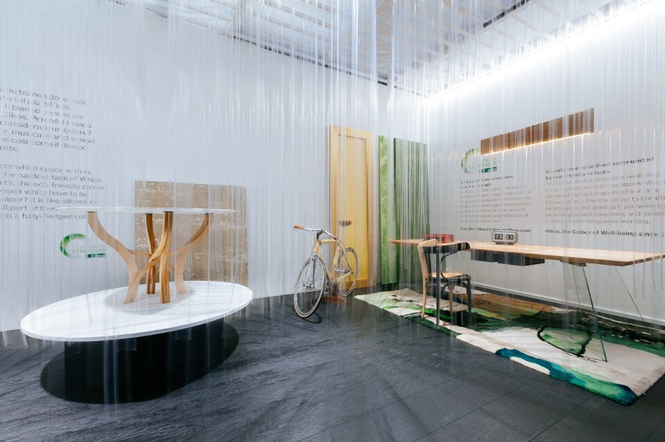 “White Ben-essere” nell’ex chiesa di San Carpoforo è stata tutta dedicata all’enorme offerta di bianco Oikos e all’impegno che l’azienda mette nella tutela dell’ecosistema e della cura della persona concetto, eliminando l’impiego di formaldeide nei suoi prodotti. L’allestimento, firmato da DAS 16.8 – B. Candoni, S.Gortana – si è tutto incentrato sul dare forma e spessore visivo alla percezione del benessere.