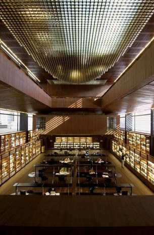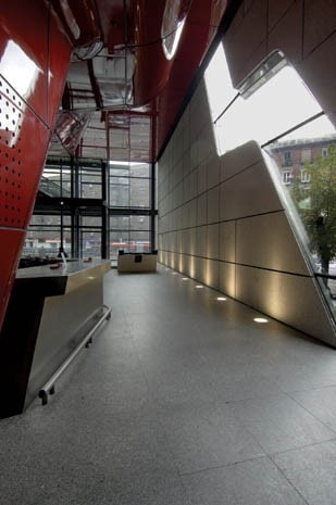 In hygienic contrast to the inert gravity of the 18-century hospital housing the existing museum, the extension groups together the new temporary exhibition galleries, the auditorium and the library beneath a floating, cherry-coloured canopy, which is sculpturally perforated to illuminate the spectacular central atrium. Lightened by transversal voids, translucent latticework and steel mirrors giving an immaterial air, the complex was built with cold passion and an analytical spirit on a tight trapezoidal lot adjoining the work of Sabatini. Future visitors standing on the terrace lookouts (if they are finally opened to the public) will also note its role as an urban hinge between the monumental silhouettes of Atocha Station on one hand, and the cluttered, folksy Lavapiés quarter on the other.