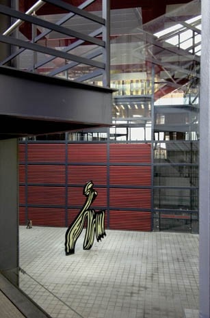 The critic can only lament venial sins: the difficult agreement between stone claddings and enamelled metal curves, the hapless cut of the canopy where it meets Sabatini’s cornice, skylights in the upper exhibition gallery giving way to terraces for the offices, or the absence of the trees that were to be planted in the atrium so as to allow expanding the storage basements. Presided over by Brushstroke, a huge Lichtenstein sculpture on loan, this bleak atrium is beaten by the wind and filled with traffic noise that is deflected by the canopy and multiplied by the glass enclosures. It provides a second entry to the museum, giving access to the pompously denominated “Nouvel Space” without crossing through the old hospital. Via this atrium one also enters a warm, well-stocked bookstore which adequately overlooks the soaring void of the library, both of which are screened from the busy street by brise-soleils that do not entirely stop the sun from falling on the books. The atrium also leads to the café-restaurant under the cantilevered belly of the auditorium. Furnished with fanciful tables and counters by another architect, this area is particularly pleasing in the warped crack between the two volumes (never mind the restaurant tables getting lost in the dark) and frankly shocking in the horizontal projection of the auditorium profile on the facade, which ill-fatedly cuts the gridded granite cladding.