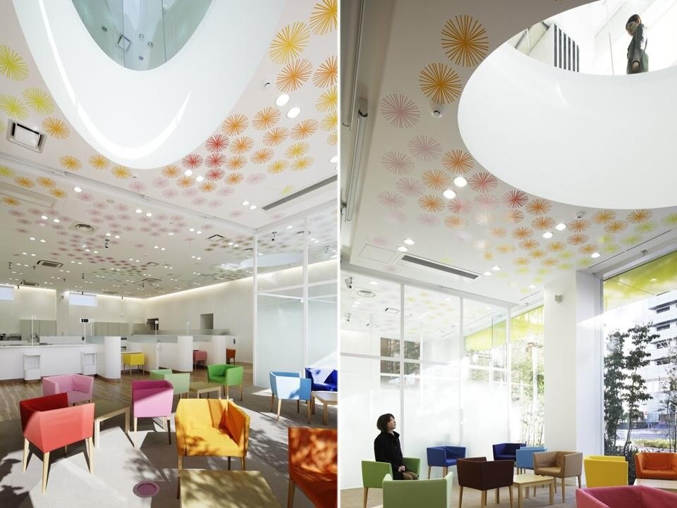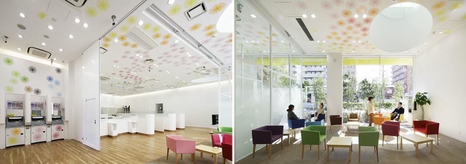 On the first floor ATMs, teller windows for operations and for consultation are all organized in an open space furnished with chairs of 14 different colors that contribute to the festive atmosphere.