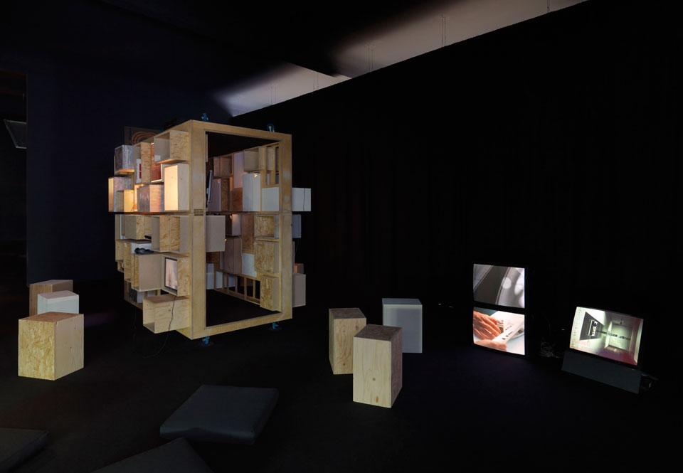 The exhibition press release tells us that "the groundbreaking artistic approaches of a generation of CAVS directors and fellows were ahead of their time", yet The Future Archive has the paradoxical property of making current projects look retro instead of highlighting the actuality of the archival proposals. Upon entering the exhibition space the visitor finds him/herself immersed in complete darkness — the exhibition design was inspired by Aldo Tambellini's 1965 performance Black — from which spectral shapes start to emerge. Amongst these one can see a sturdy shelve system, The Turtle Two (2009), Luis Berríos-Negrón modular mobile which houses the bulk of the CAVS archive; Centerbeam (1977-1978) a collaborative multimedia installation shown at Documenta 6 (1977) in Kassel, along with a film documenting the project's reception by Richard Leacock and John Rubin; Aldo Tambellini's Black Film, seven experimental films in which the artist manipulated the negative with ink, stencils and chemicals to create a distressed effect; or Maryanne Amacher's Boston Harbour (City Links #4 and #14) (1973-79), a compilation of sound works which model the relationship of resonances to their environment.