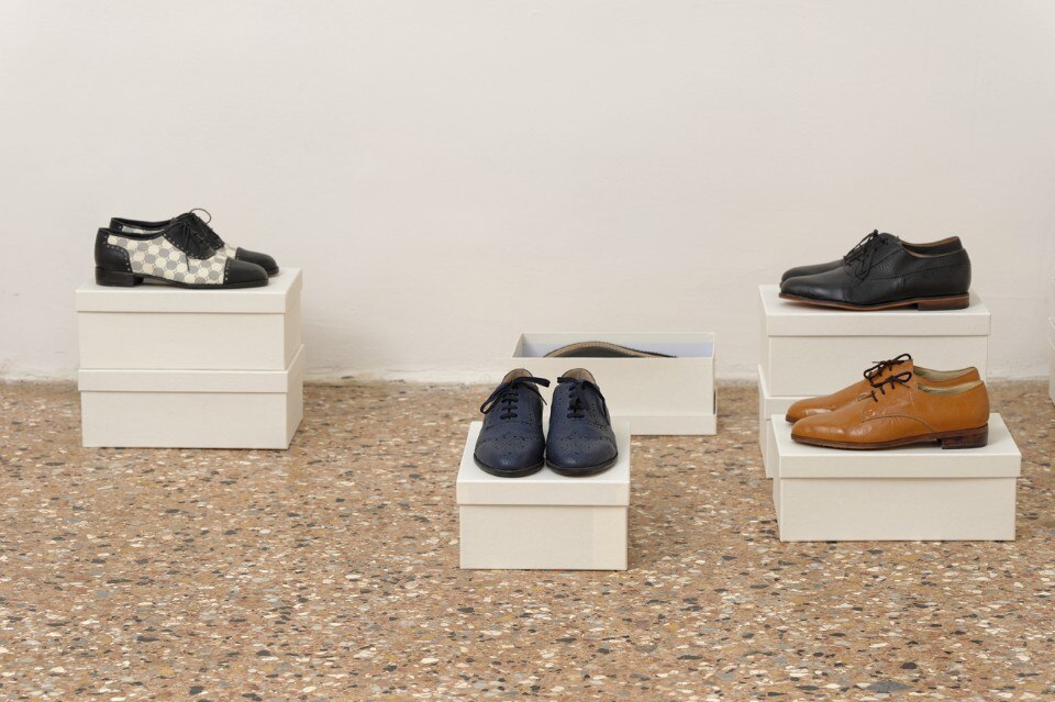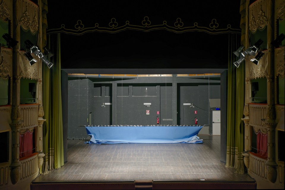 The route developed by Christodoulos centres on a generally worldly and material vision. The recomposed floors, the earth, the shoes (Untitled, 2015), the real rolled-up “red carpet” (Operation Serenade, 2012) and the theatre backdrop. A recurrent motif that has accompanied the artist’s work since 2007, the backdrop reproduces the line of the horizon in an “extra-theatrical” gesture and concept that alludes to a disenchanted perception of the theatre tradition.