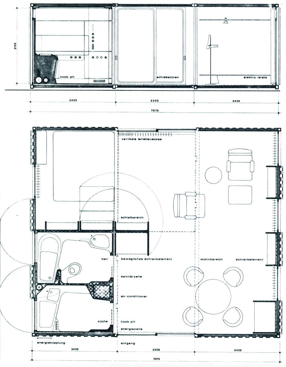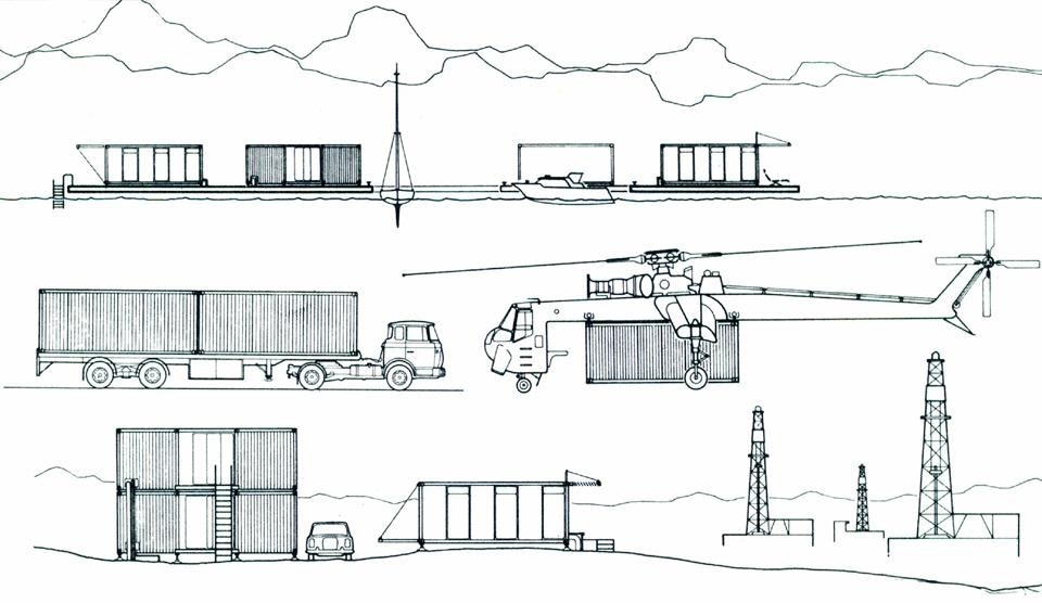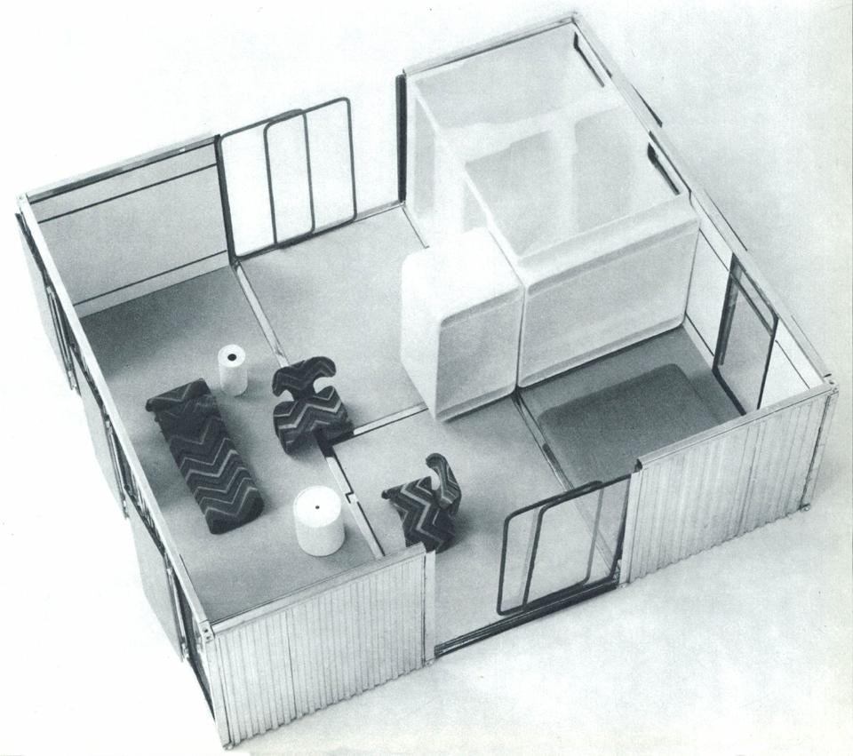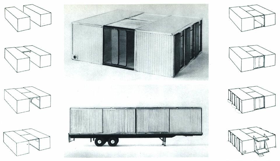 The idea of a "self-packed house", a house which can be moved entire and fully equipped, from one site to another, by land (truck or train), rivers (raft) or air (helicopter). Its own walls, partially folded, form the transport container. It consists of two equal units: one fitted with the bath and kitchen equipment (prefabricated in plastic), with wardrobes and the bed, the other containing the living- and dining room furniture. This is a proposal which may be of interest not only for holidays, but for all sorts of temporary housing, during congresses, trade fairs etc., and for university campuses. The project is by Wilfried Lubitz, a student at the Krefeld Werkkunstschule, Germany.