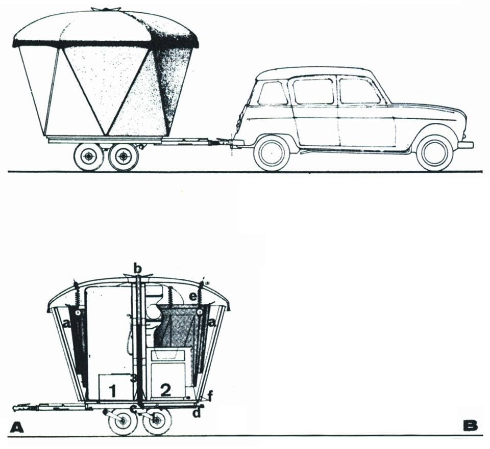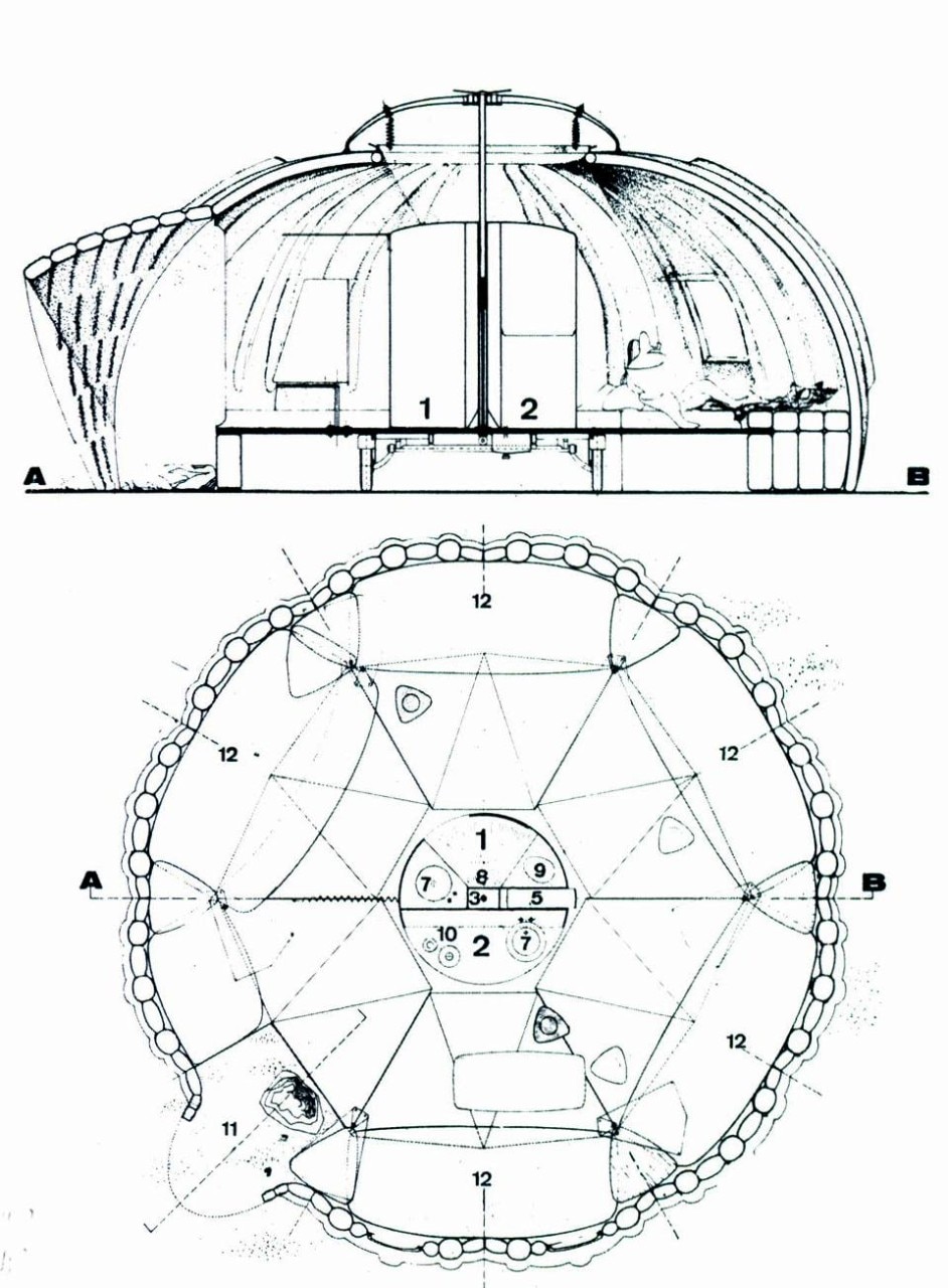 When travelling, the house is reduced to the mere volume of the facilities cell (kitchen and bath), mounted on a wheeled trailer, a volume of 5,98 cu. metres. On reaching the site chosen for the stop-over, the house "develops" in less than half an hour into a dome covering an area of 24,80 square metres. The side walls of the facilities cell are lowered horizontally becoming a hexagonal floor, and the translucid lid of the cell rises (by means of a pneumatic winch) releasing the tent which is blown up to form the dome (a compressor connected to the car engine is used). The dome contains six pneumatic beds and six revolving clothes supports.