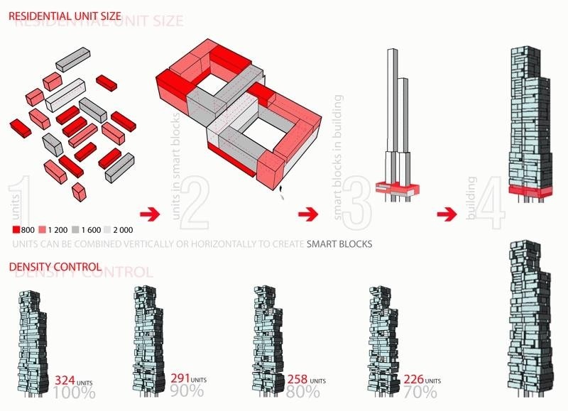 "Instead of disguising the rich potential of towers that have a mix of uses, we looked for a way to express that diversity," Beckmann noted. The firm used parametric computer-modeling software to test a wide range of possibilities. Out of this iterative process, Beckmann and his firm, Axis Mundi, proposes a new way to organize and express tall buildings: the Vertical Neighborhood.
