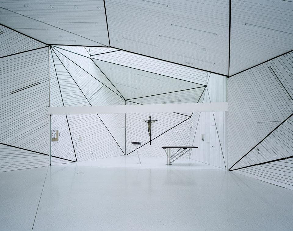 The study of duality between man and work, relating to the interaction between the pastoral care and the steel company, led to the concept of a complementary addition to the area through a new "built landscape". Conventional church buildings, e.g. a basilica or tower, would not be able to achieve their independent meaning in this area as the voestalpine's site is mainly dominated by relatively high buildings (cylinder, spheres, cone, tower, etc.) with incomparably large dimensions.