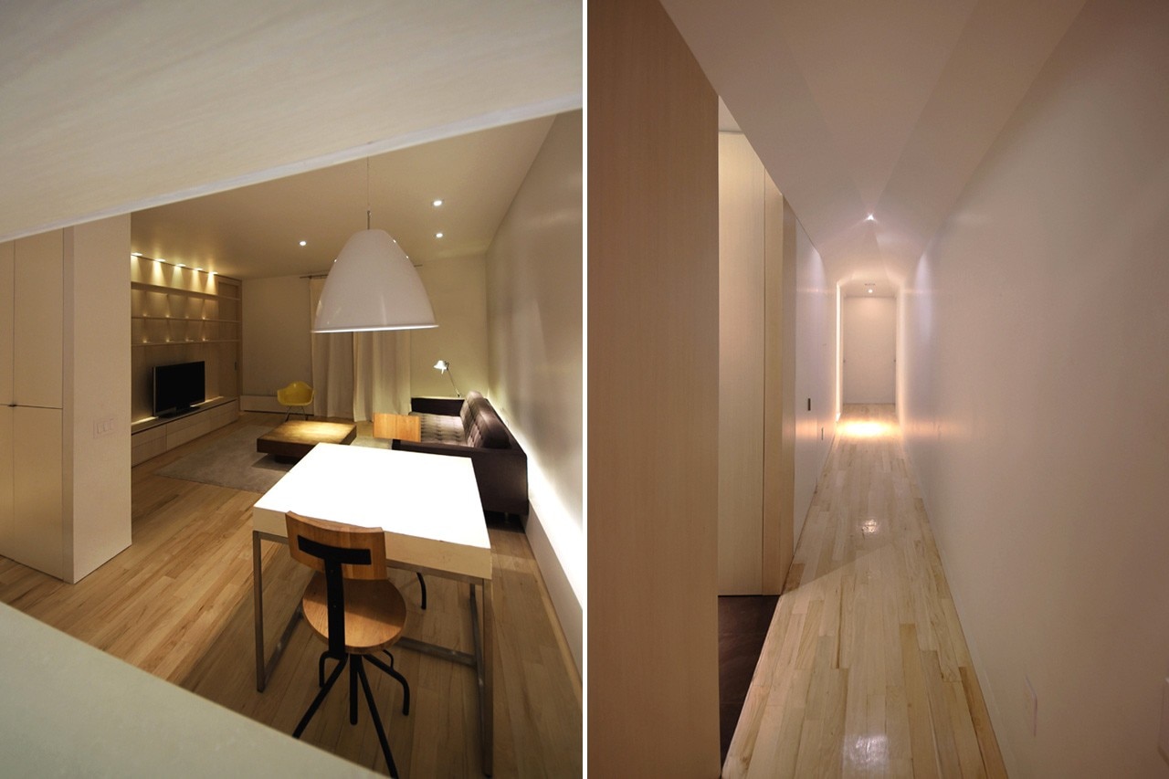 The long hall way located in the center of the apartment designed in Brooklyn by Yuuki Kitada connects public space and private space.
