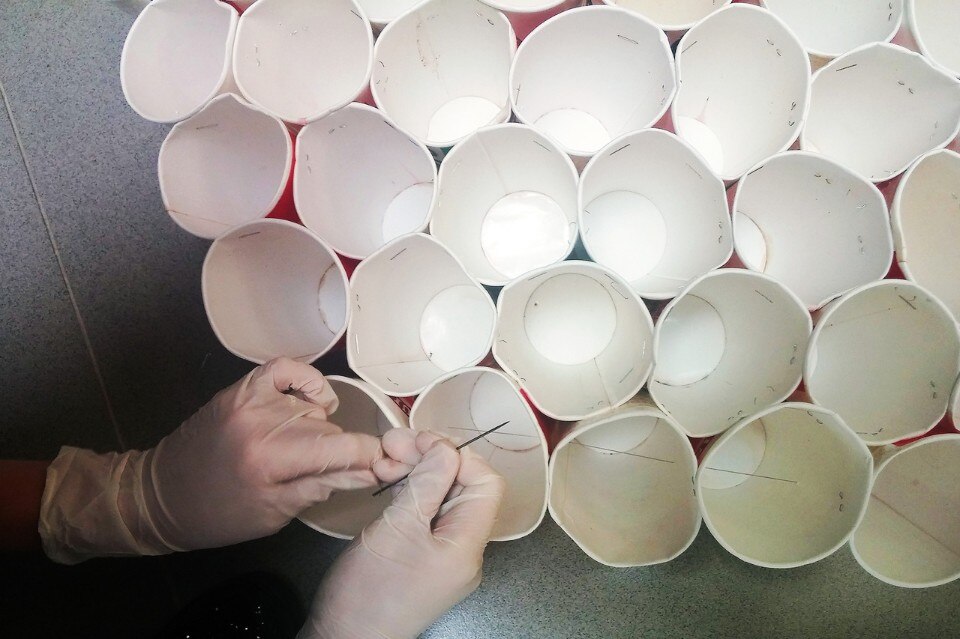 The paper cup pavilion was constructed from waste tea and coffee cups collected from university canteens and a shopping mall for a period of three months. About 15,775 cups, collected as bricks for the pavilion, were washed and dried. The cups were held together with a total of 4 kg. staple and sewn with string for structural durability.