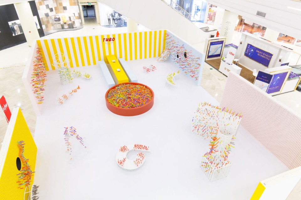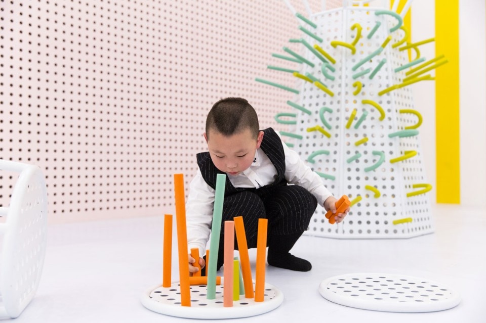 Kids are encouraged to colour the space by filling the holes of the structures using the foam tubes. They can stick the foam tubes in the holes, tie and slot them in however they like in order to create a 3D colouring effect.