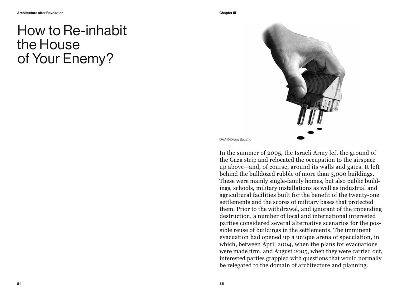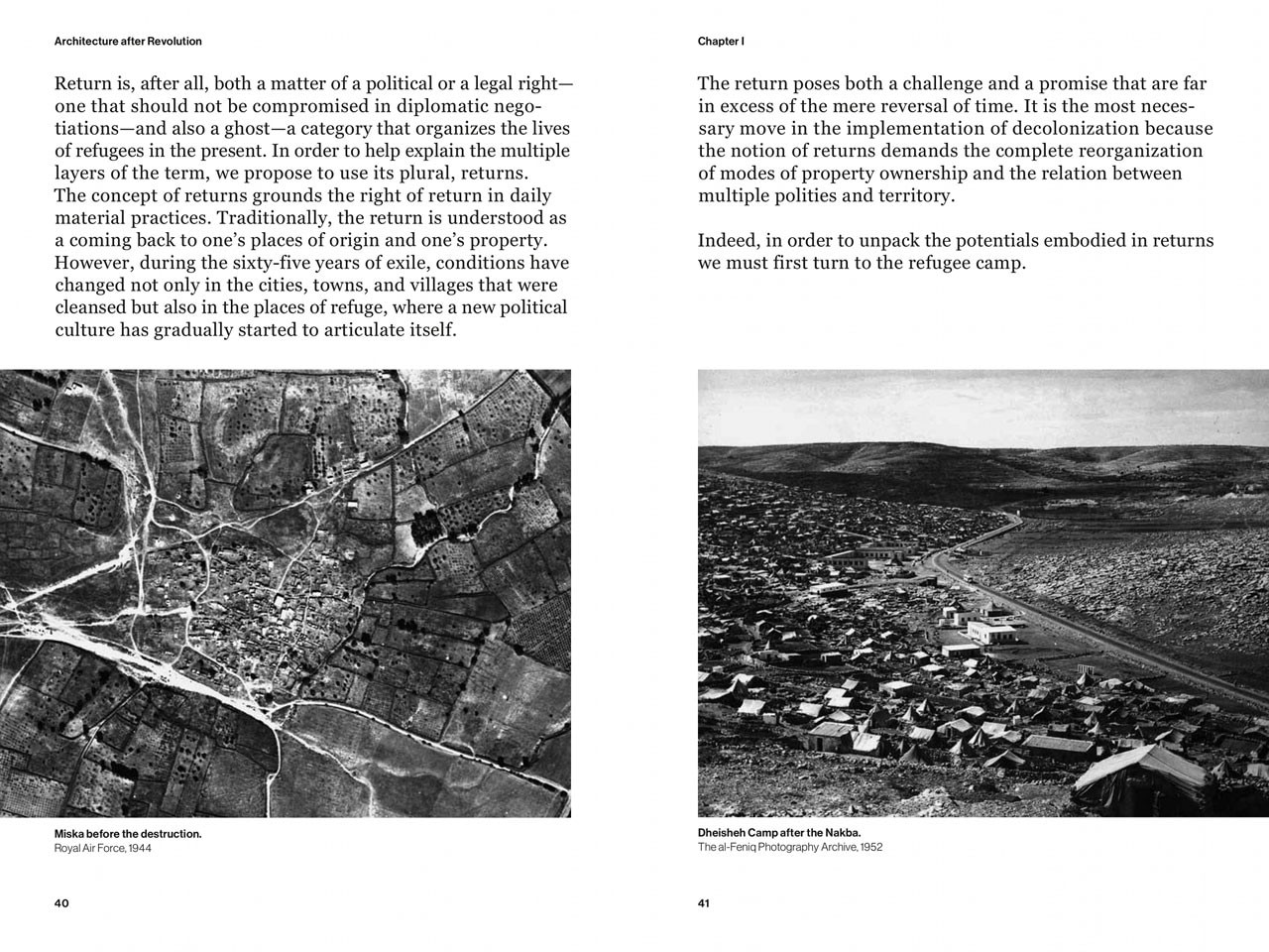 The book is arranged into five chapters, though as each one is in fact many, it would be unjust to reflect on them as individual projects but rather as the articulation of a singular project. Through a series of entangled instances of history and architecture, the immanent significance of political terms within present-day Palestine are teased out. By polemically employing the concept of ‘colonization’ as a framework the present is made decipherable as the ground for political action while formulating what is at stake when we consider notions of justice in such charged environments.
