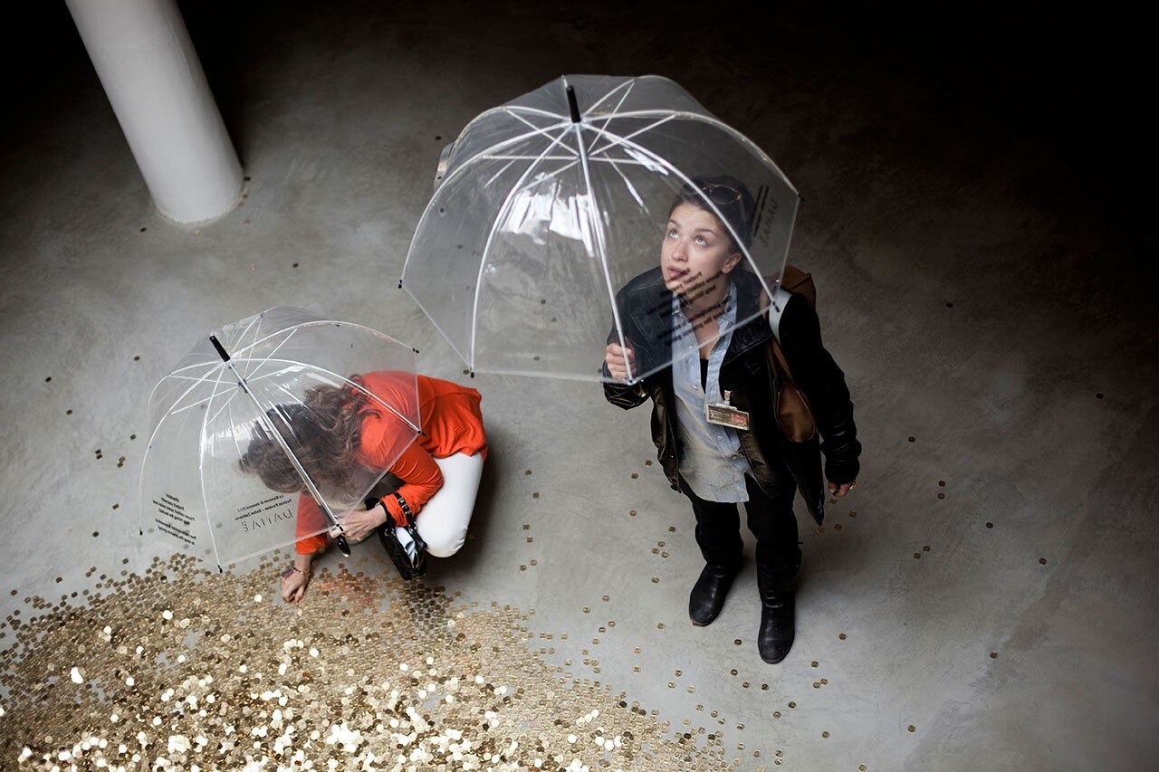 L’opera di materializzazione del mito di Danaë e la sua riproposizione in chiave moderna ha pervaso tutti gli ambienti del padiglione russo e ha richiesto un intervento strutturale inedito dalla sua costruzione, avvenuta nel 1914 per mano di Alexei Shchusev: la creazione di un’apertura tra i due piani. Da un foro passa il secchio colmo delle monete coniate da Zakharov—ognuna è una Danaë—, distribuite lungo un percorso circolare: cadute dal soffitto del primo piano come pioggia fino a raggiungere il piano terra, sono raccolte da donne protette da un ombrello per essere poi riposte nel secchio issato a mano al primo piano e quindi re-immesse nel circuito che le porterà di nuovo al soffitto. La performance agisce su più piani—culturale, filosofico, sessuale e psicologico—e coinvolge i visitatori nella messa in scena di un mito e dei suoi valori.