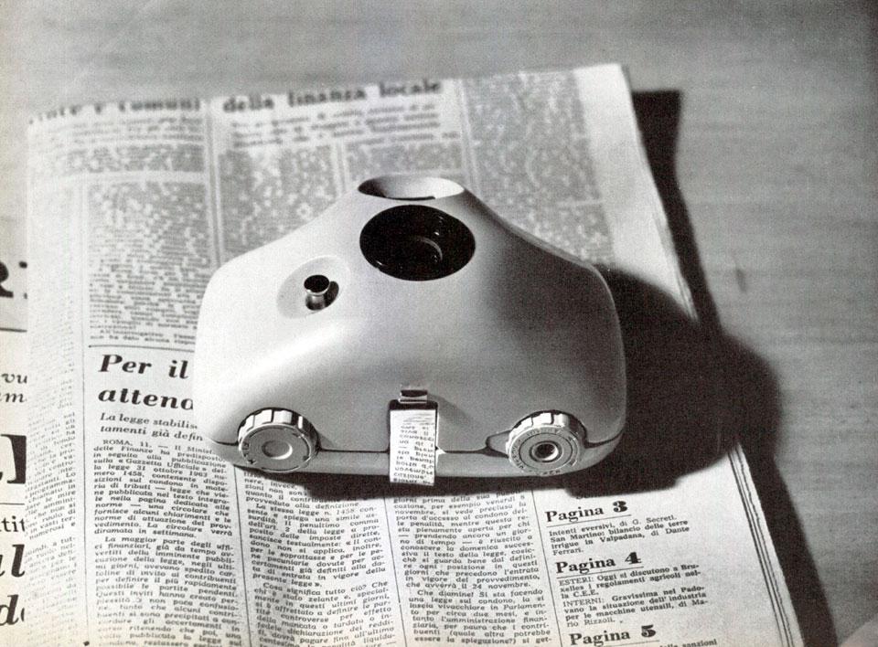 Per i ragazzi, non una macchina economica che si finge di lusso, come avviene (con finta pelle, finto acciaio, finto esposimetro, finti indici grafici, ecc.) ma una macchina che si caratterizza e distingue per la sua propria e nuova forma, possibile solo in plastica. E che attrae non per 'mimetismo', ma per allusione fantastica (Al mondo fantascientifico ...).