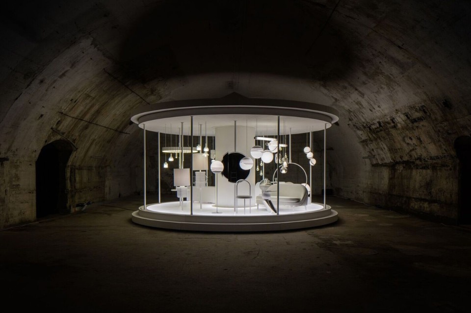 Impeccable the all-white installation by British designer Lee Broom, a carousel in motion displaying his most famous pieces. It stands out against the shabby walls of the station depot, creating a strong visual contrast.