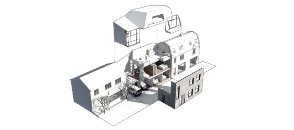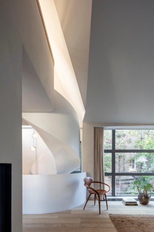 Il fulcro dell'abitazione trasformata è uno spazio aperto a doppia altezza, caratterizzato da una scala a chiocciola tailor-made che collega i tre piani, dando vita a una continuità tra le diverse aree della casa seppur poste su più livelli. La scala – un “vortice scultoreo di spazio illuminato a giorno” – grazie alla sua forma organica, diventa il cuore pulsante dell’abitazione, contribuendo a rompere la rigida geometria di una casa londinese dei primi del Novecento.