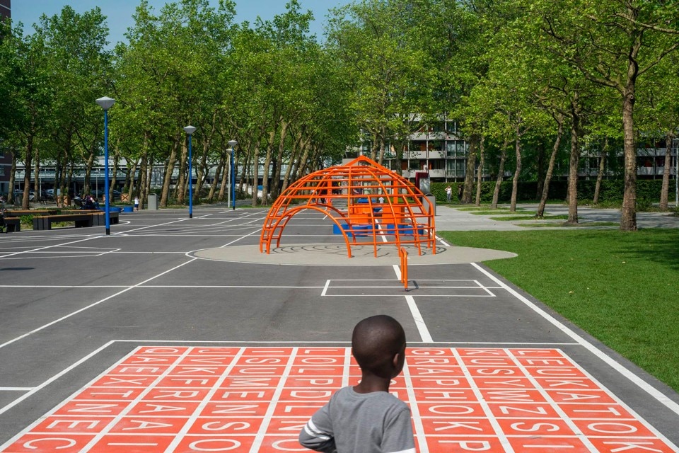 Nei punti della griglia si trovano diversi giochi che prendono ispirazione dai playground modernisti di Aldo van Eyck ad Amsterdam. Per uniformità e coerenza i diversi elementi sono dipinti di arancione e blu, colori che sono stati anche utilizzati per la recente ristrutturazione di edifici adiacenti. Uniti dalle stesse cromie, gli oggetti hanno una nuova identità. Oggetti indipendenti formano insieme un museo all’aperto di elementi da gioco.