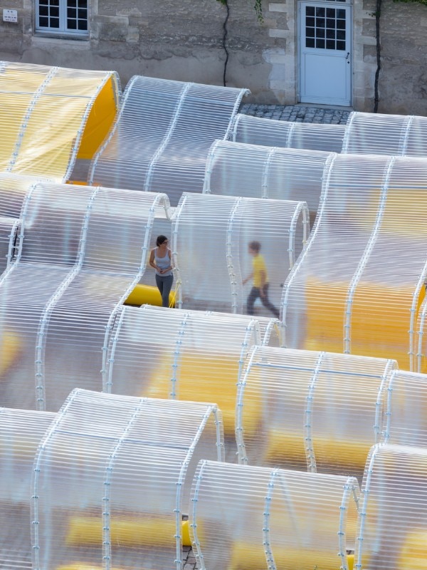 Resistente e impermeabile, il materiale di rivestimento diffonde la luce e crea giochi mutevoli e iridescenti. I riflessi arcobaleno sono caratteristici dell’estetica degli architetti. Il grande padiglione è formato da forme flessibili e organiche in armonia con l’ambiente naturale. SelgasCano difende l’idea che “la natura deve prevalere sull’architettura”. I sedili gonfiabili installati nella struttura, attaccati da cinghie, consentono ai visitatori di sedersi, appoggiarsi o sdraiarsi, in un contesto ricco di laboratori, concerti, presentazioni, conferenze, mercati, giochi, momenti di relax, passeggiate...