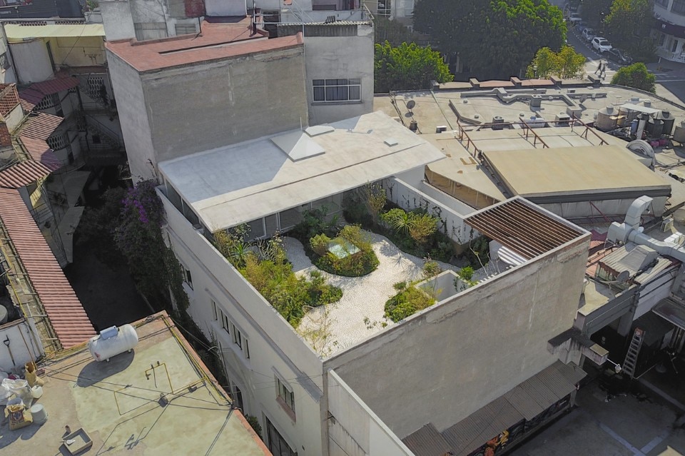 La struttura esistente, ormai in decadimento, è stata liberata dalle eccessive partizioni interne, creando spazi abitativi generosi. Gli architetti hanno inserito nuovi cortili e aperture zenitali per massimizzare la luce del giorno. Sulla sommità dell’edificio è stato aggiunto un nuovo piano, con un grande tetto sporgente di cemento bianco per riparare dal sole. Le nuove stanze sono tutte minimali per esaltare il verde del giardino, mentre il piano superiore si apre con una vista panoramica sulla città e sul verde rigoglioso attraverso partizioni di vetro a tutta altezza che ricreano l’effetto di un’oasi in città.