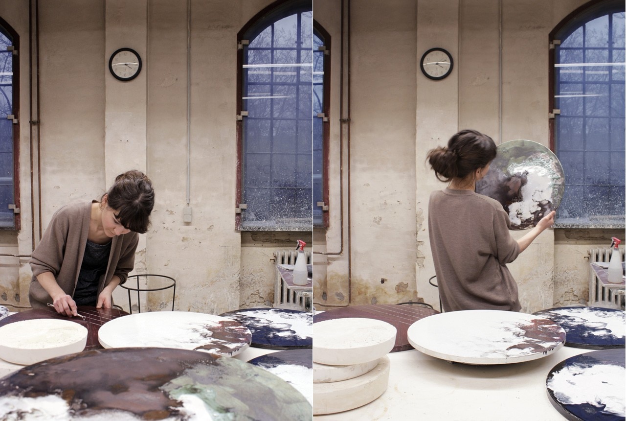 Il processo di cottura trasforma la sospensione liquida di ossidi metallici e minerali in polvere in varie finiture superficiali simili al vetro. Per i Ceramic-tables diversi smalti liquidi si mescolano sotto l'influenza di rotazione e aria soffiata per lasciare tracce di movimenti fluidi e pattern simili a sbuffi di fumo, che si solidificano col calore.