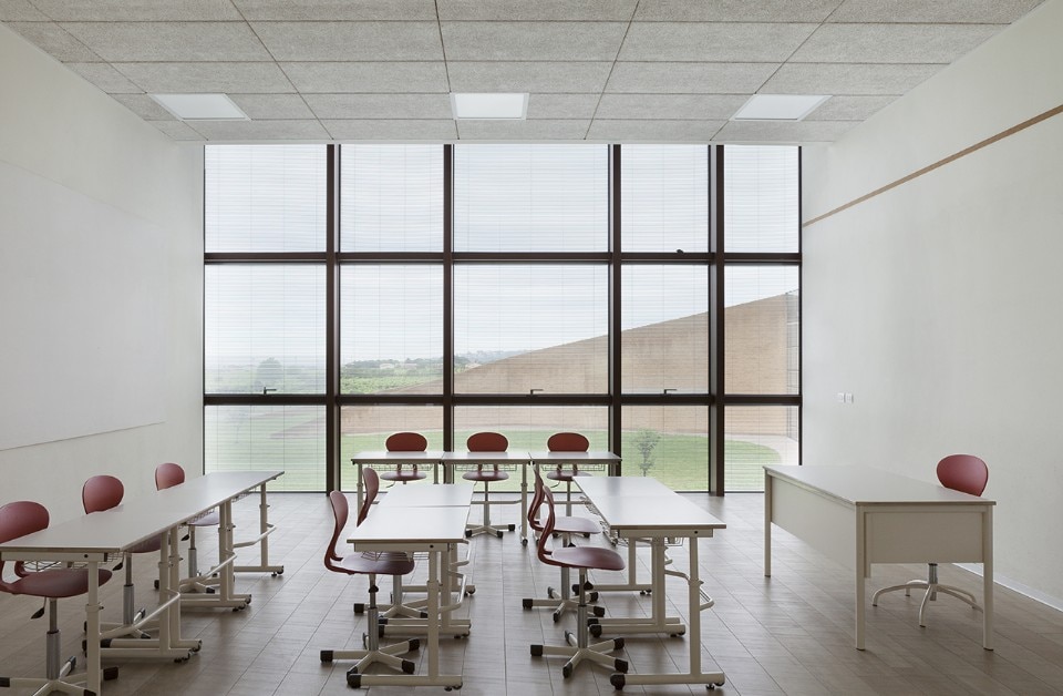 The same type of design sensitivity can also be found in the solutions for the south facade of the building, characterised by an irregular shape and large full-height glazed openings that visually connect the classrooms and other interiors with the courtyard. The aluminium windows and doors are equipped with triple glazing, housing about 700 ScreenLine® shading systems: these blinds integrated witin the glass units guarantee excellent energy performance and do not obstruct visual contact with the outside, as is usually the case with some screens outside the facades. The integral blinds guarantee absolute protection from dirt, dust and atmospheric agents, without the need for maintenance.