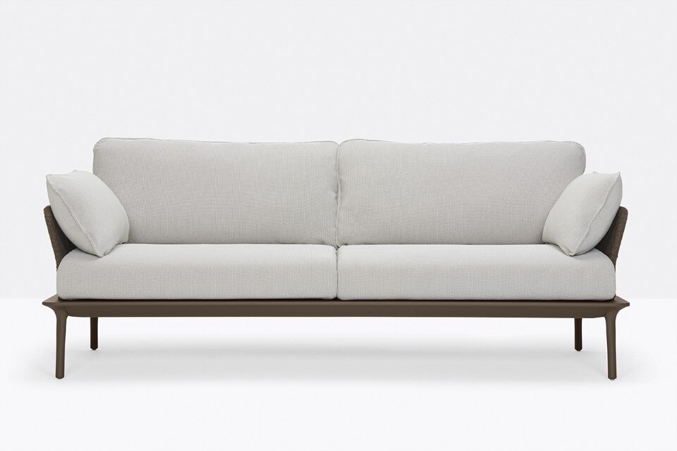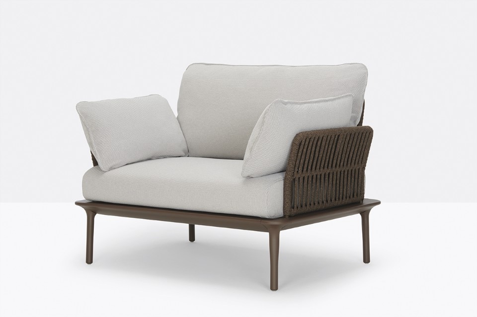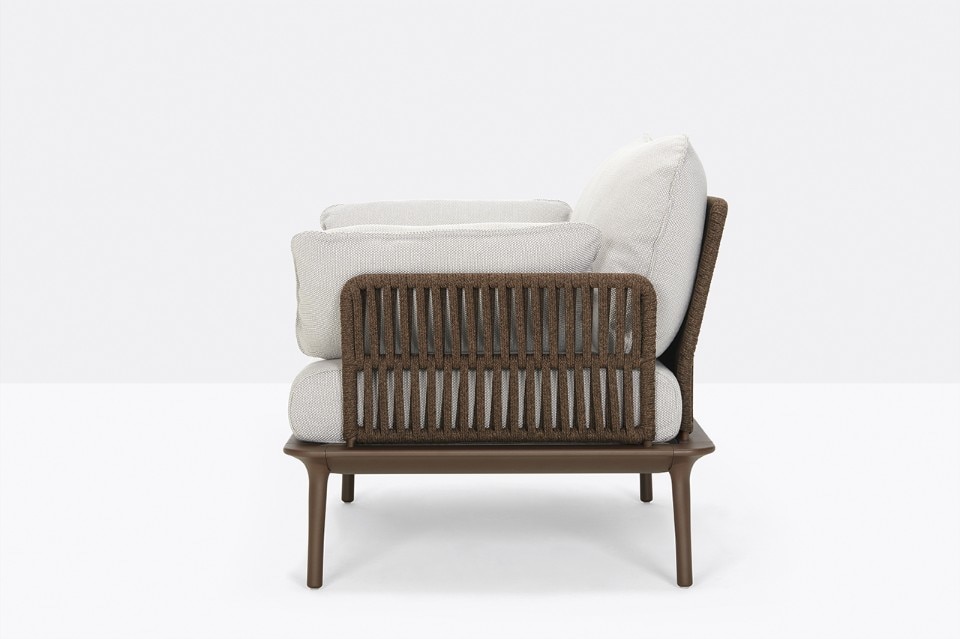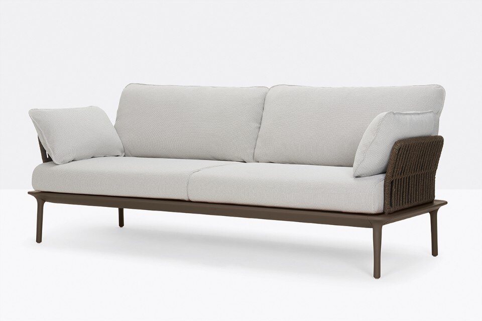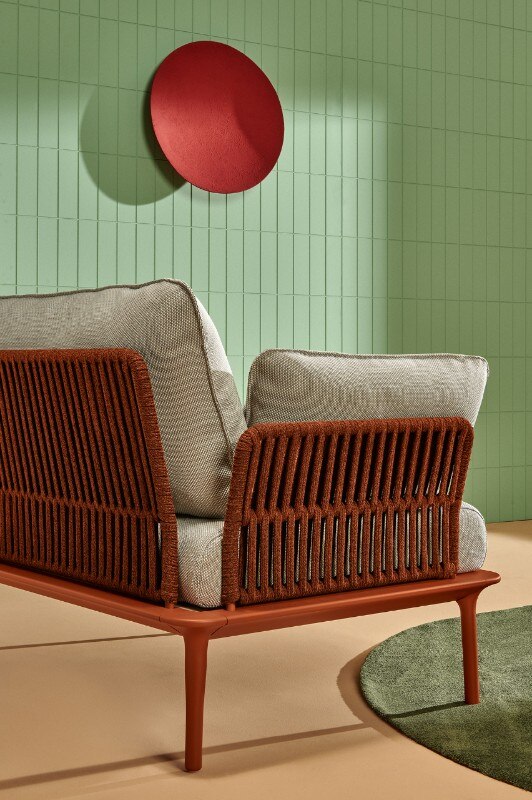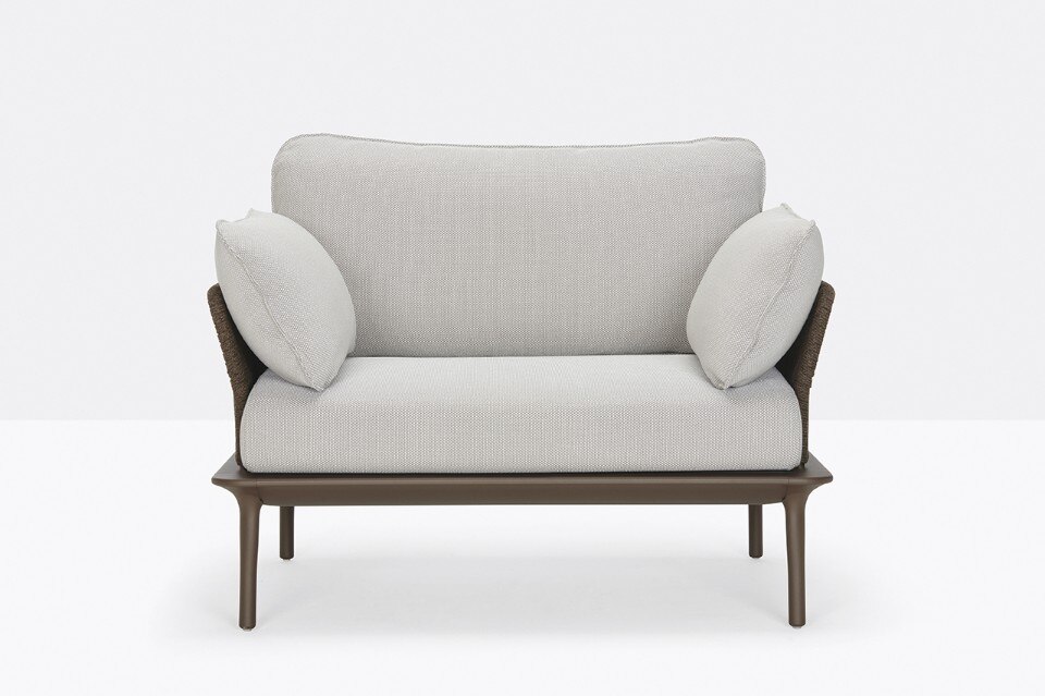 A three-seater sofa and a lounge chair transform open spaces into refined and contemporary urban living rooms. Designed by Patrick Jouin, Reva Twist is a collection featuring soft lines and generous dimensions. The structural base is composed of four tapered die-cast aluminium legs and a perimeter frame in extruded aluminium. Armrests and backrests are covered with a weave made from a flat polypropylene rope, which resists the weather and gives the furniture a natural look, while soft cushions enhance the comfort.