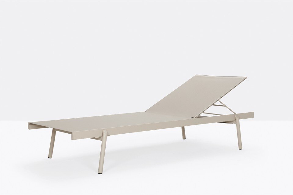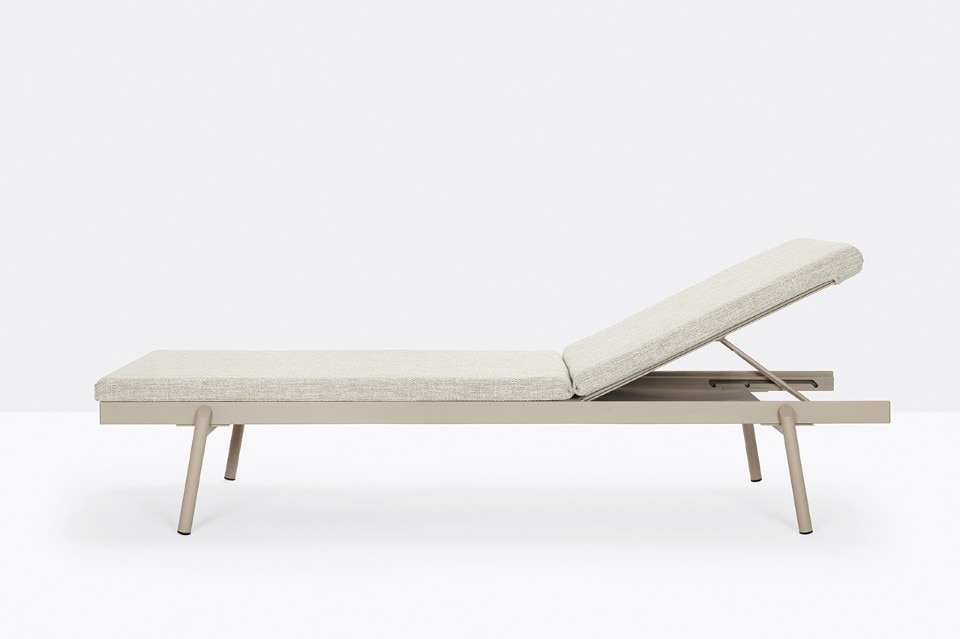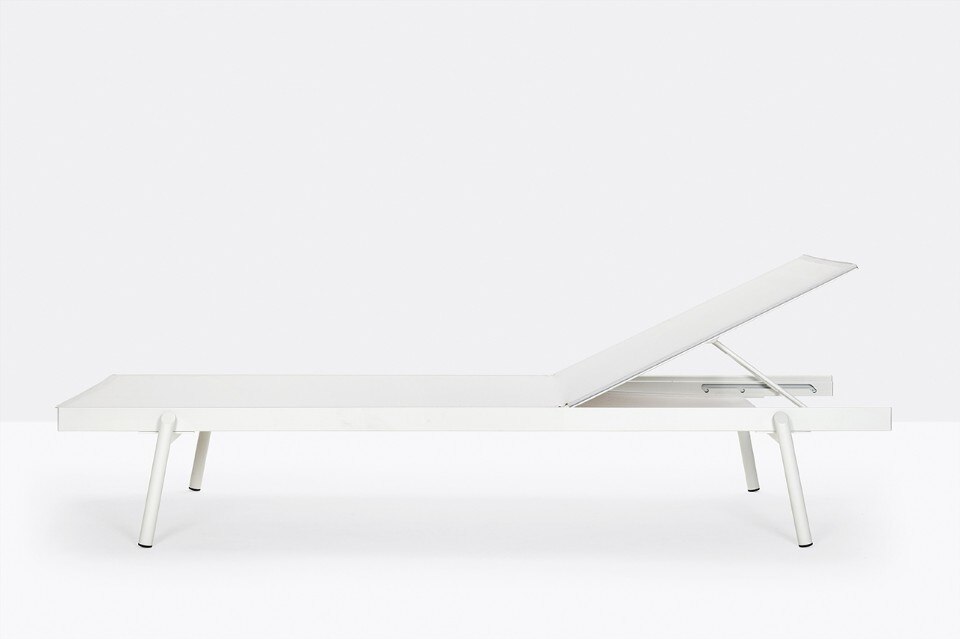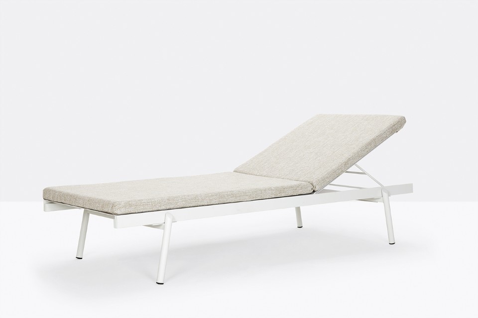 The Rail sun lounger is characterised by elementary, modern and elegant geometries. The structure is in aluminium with four angled legs in stainless steel; the seat and backrest are in textilene, with the possibility of adding a comfortable cushion in dry-feel foam upholstered with a water-repellent fabric.