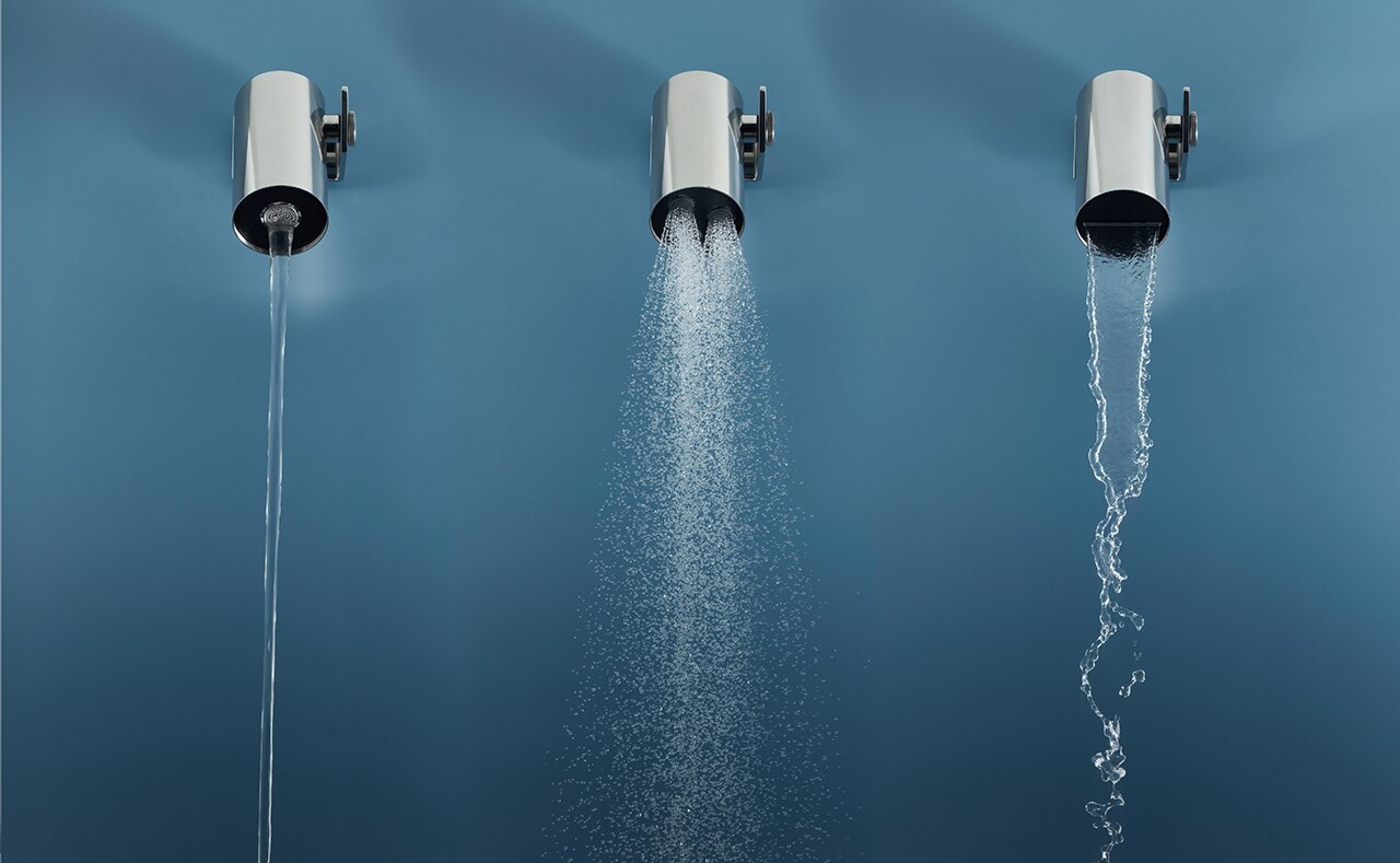 A key feature of the overhead shower is the possibility to choose between three jets: Rain, Laminar and Cascade. The Rain jet is gentle and guarantees low water consumption (only 8 litres per minute). The three emitters of the Rain jet can be individually oriented to customise the water flow and make the shower moment unique. The O3 Laminar Jet uses the abundant flow of water to create a regenerating sensation, characterised by its transparency and low flow speed. The Cascade jet is energising and vigorous and has a massaging effect even at low flow rates.