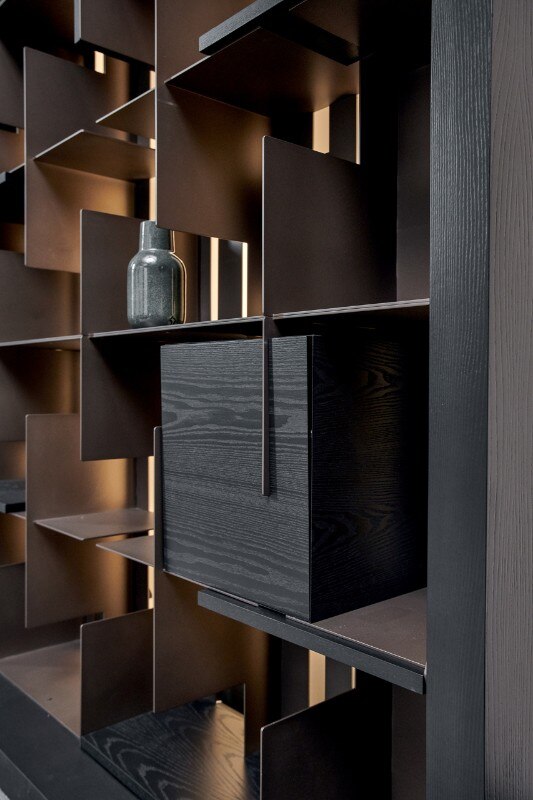 Starting from a square matrix, the furniture can be developed with a series of almost infinite variations, with combinations of tops, dividers and decorative elements. The Hong Kong modular bookcase combines the retro feel of the materials used – reminiscent of an artisanal approach – with the contemporary aesthetic of its irregular patterns.