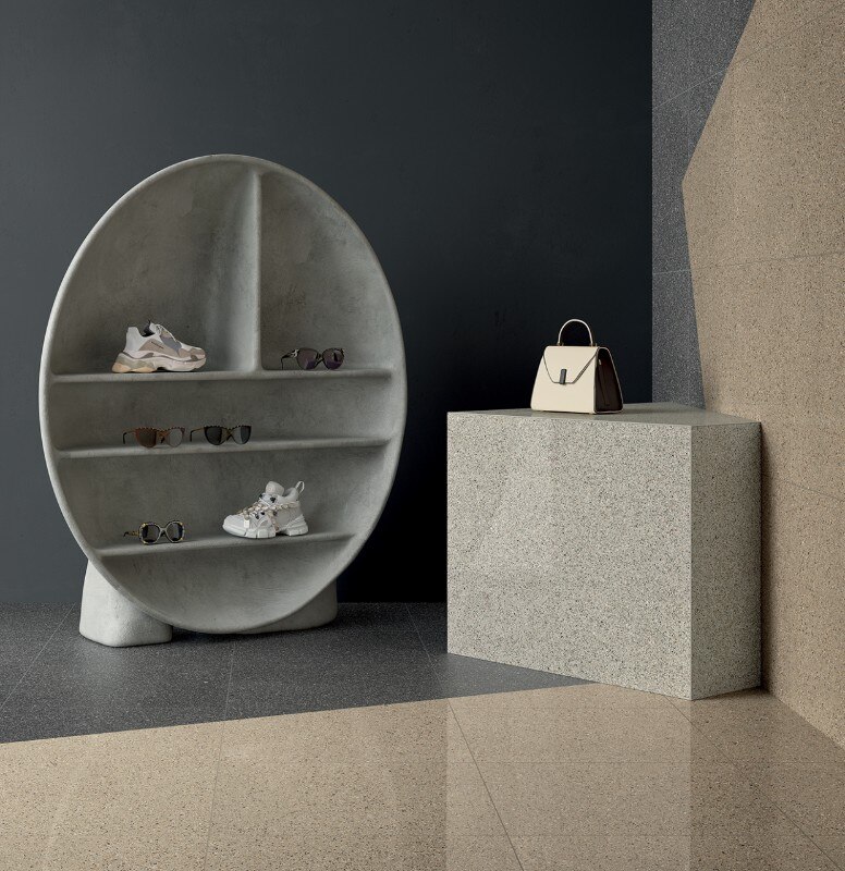 The full-body technology makes it possible to reinterpret the Venetian terrazzo in both the surface and the body of the slab, with a stylistically perfect rendering. This type of technical ceramics responds effectively to the needs of high traffic environments, where exposure to stress is particularly intense, increasing the risk of wear. The surfaces produced by Fiandre are ideal for stations and airports, tunnels and shopping malls, public places and buildings, but also in private residences.