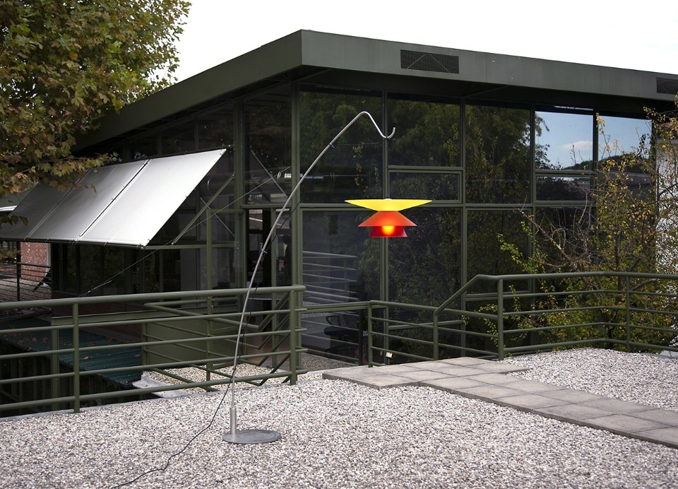 The body of the lamp is formed by the juxtaposition of conical diffusers of different shapes, sizes and shades. The playful juxtaposition of these elements allows the creation of different configurations. The shape and finish of the conical parts also determine the type of light emitted by the lamp, which can be direct or diffused. The body for indoor use is made of aluminium, painted matt black, and can be combined with the bi-satin methacrylate diffusers available in 3 sizes and 4 colours; the body for outdoor use is made of resin, painted white and can also be combined with the coloured diffusers.
