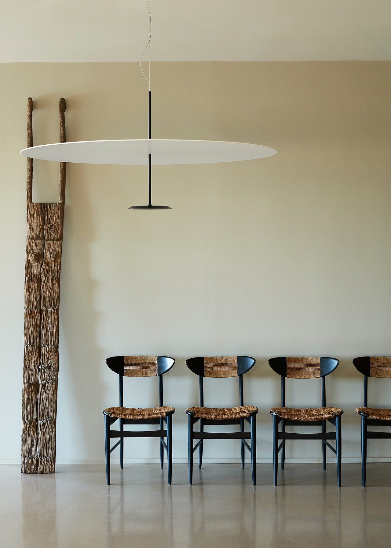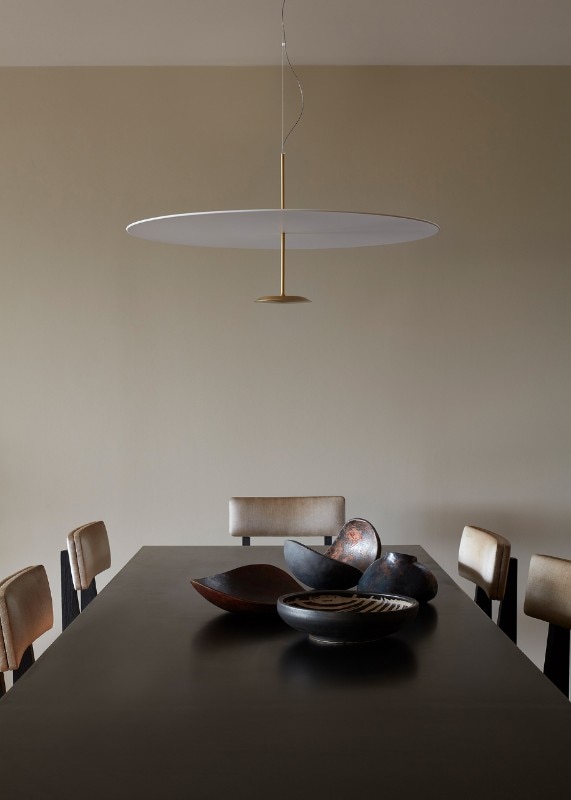 DOT is the result of the (apparently) elementary composition of two parallel discs of different sizes, which intersect a thin metal tube at the centre. The lower disc, which is smaller in size, is made of aluminium and conceals a ring of LEDs. The light is projected onto the upper disc, made of painted aluminium. When switched on, DOT appears as a thin, lightweight disc, floating in the air and generating an enveloping, shadow-free stream of light.