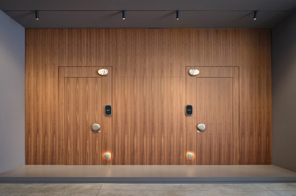 At the heart of the doors designed by Starck is a system of accessories – the handle, the step marker and the number, plus the tablet – which, in addition to characterising the openings, is used to manage the various services dedicated to hotel guests, from check-in to the management of room domotics. A wide variety of finishes is available for the flush-to-wall door – wood, matt lacquer, aluminium – to adapt the project to any aesthetic requirement.