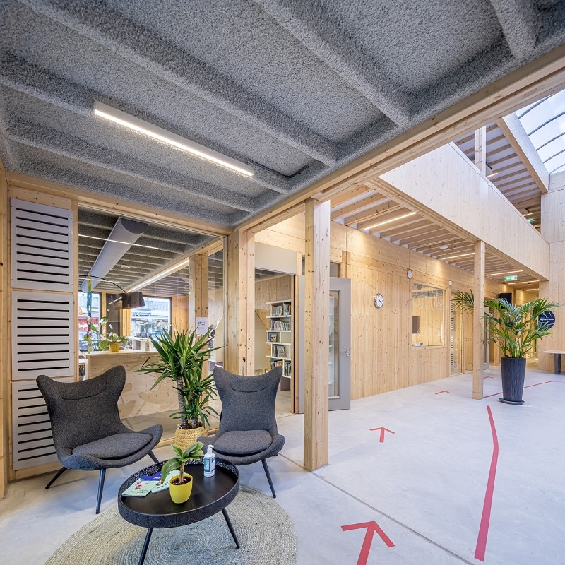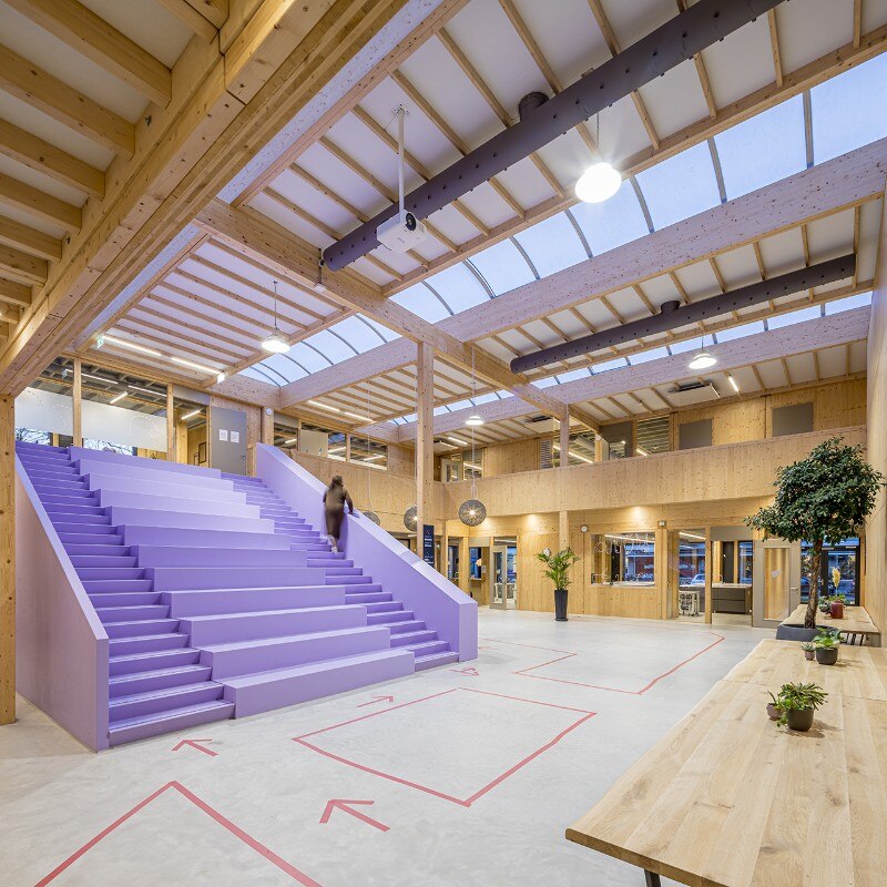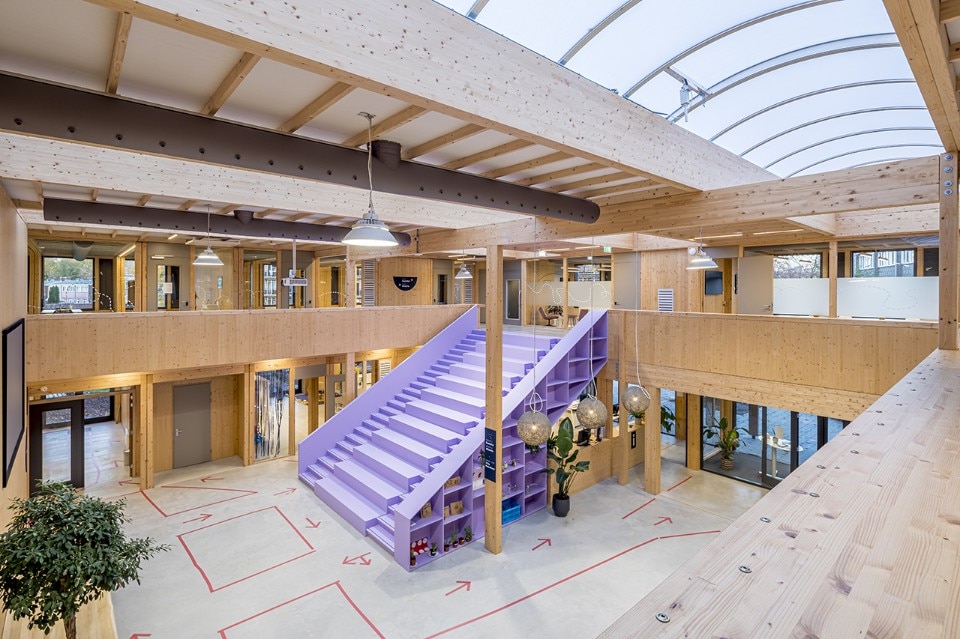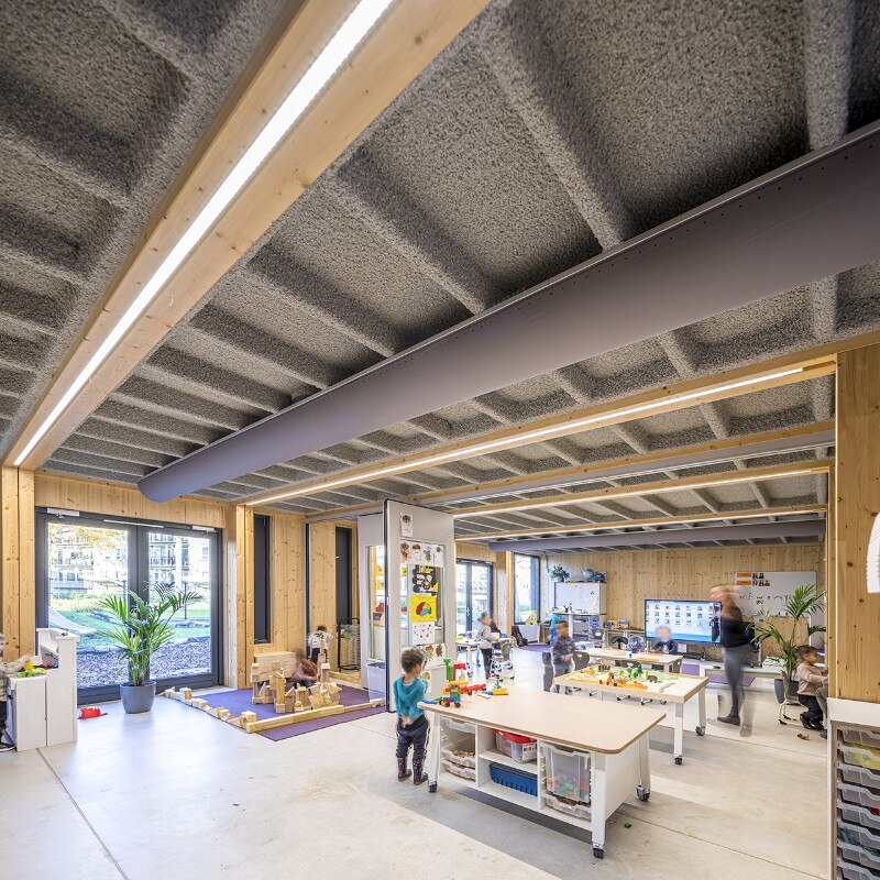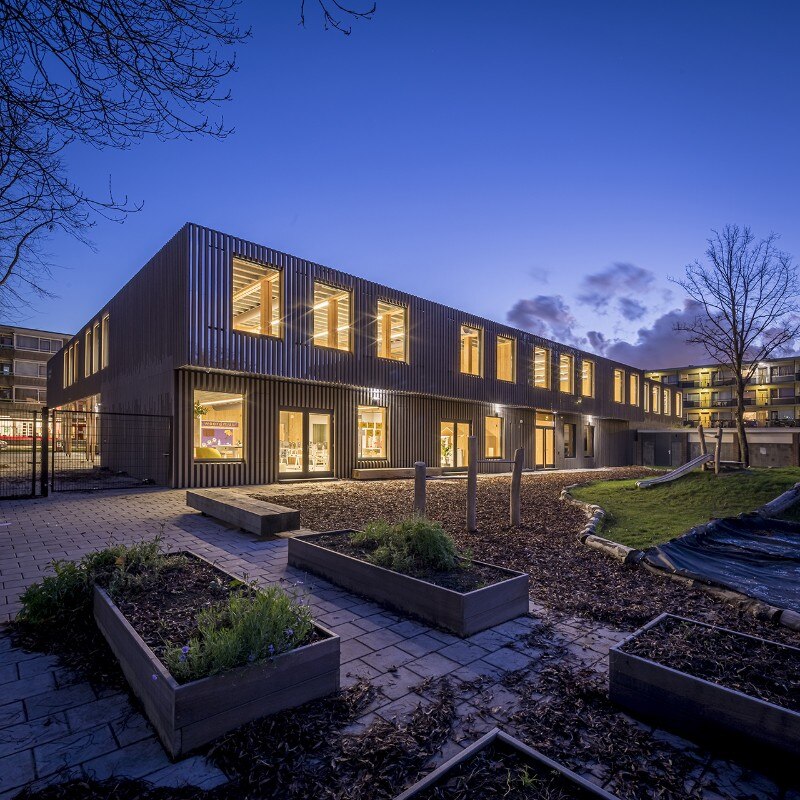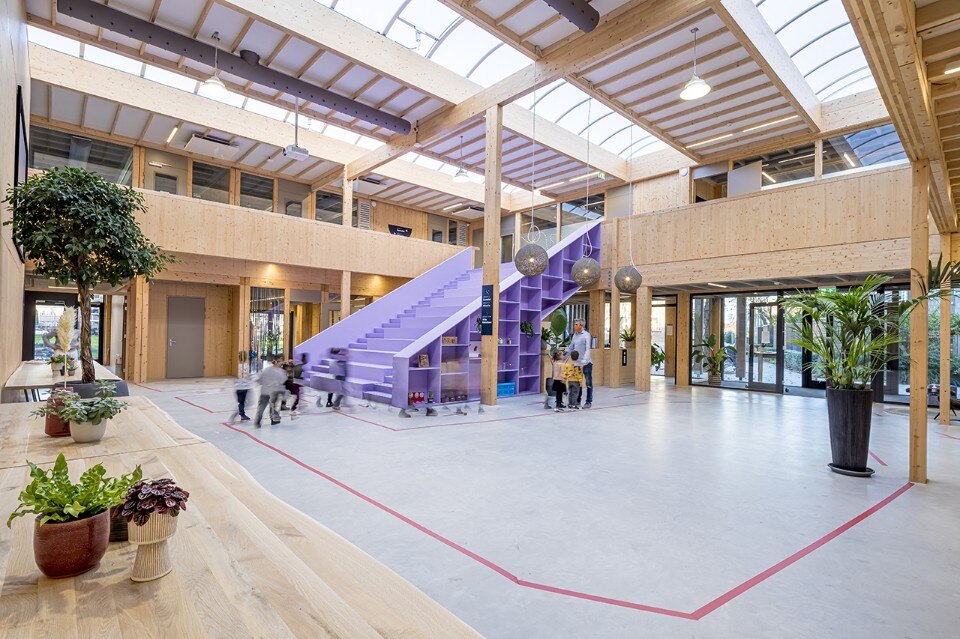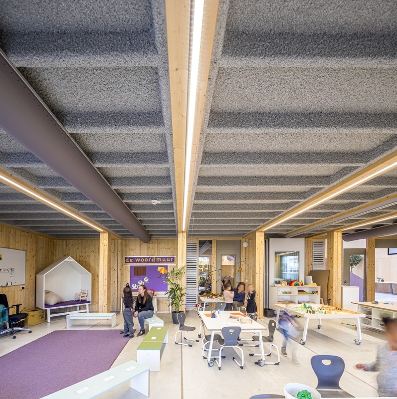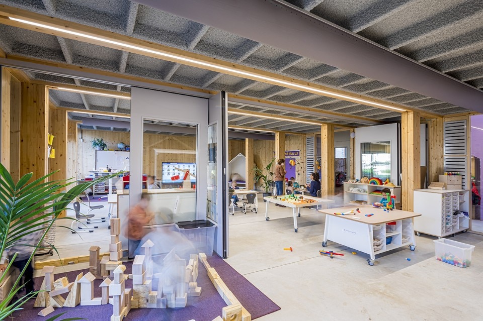 The Het Epos kindergarten is designed for the education of the future. The architecture firm SeArch, together with the contractor De Groot Vroomshoop, developed a sustainable and extremely flexible construction system: the wooden structure, consisting of 75 prefabricated modules, can be easily dismantled, moved and expanded. Thanks to the innovative assembly system, construction time is reduced to a minimum, allowing completion in just a few months.