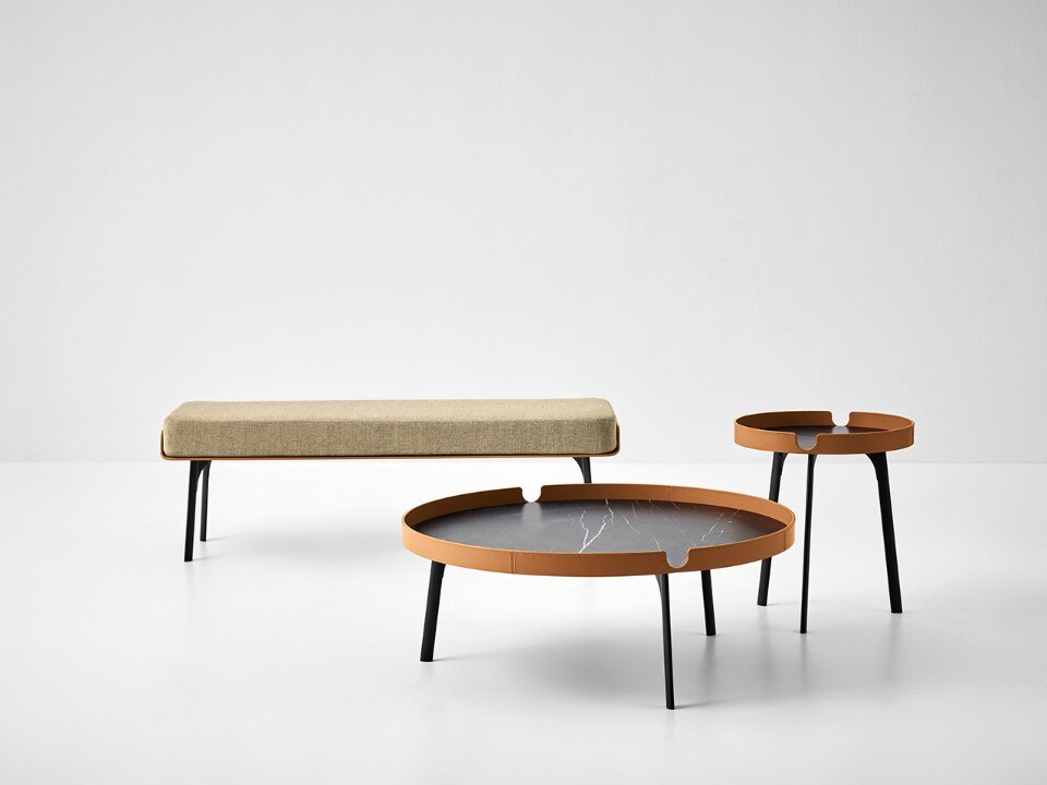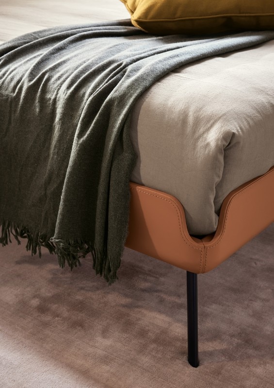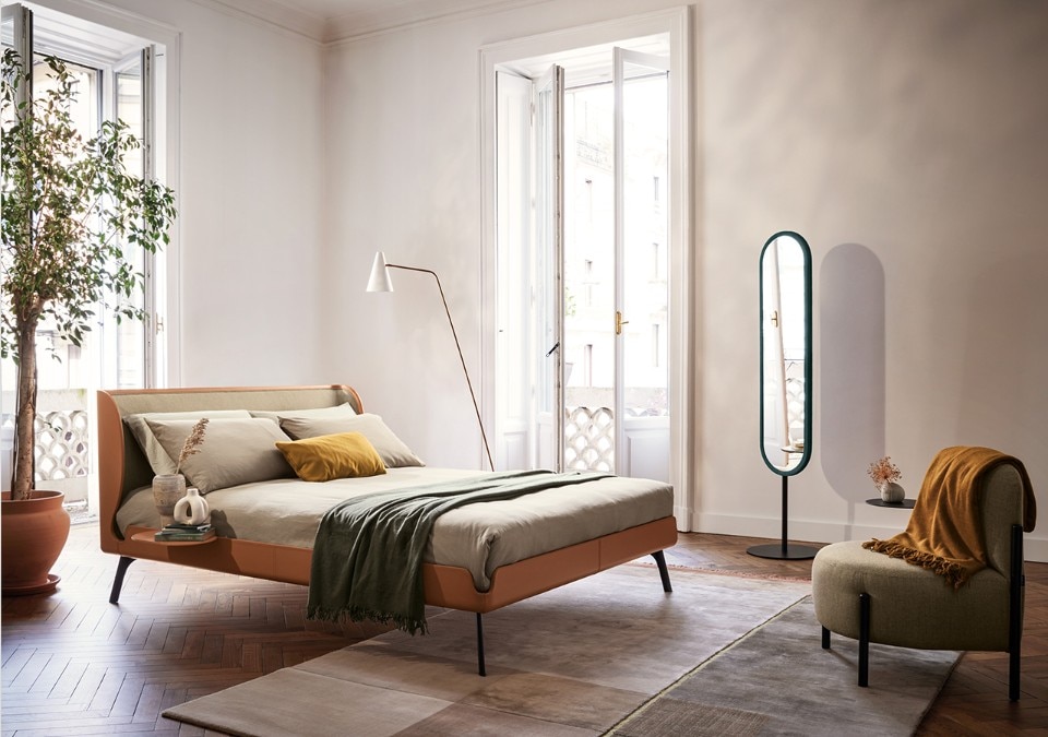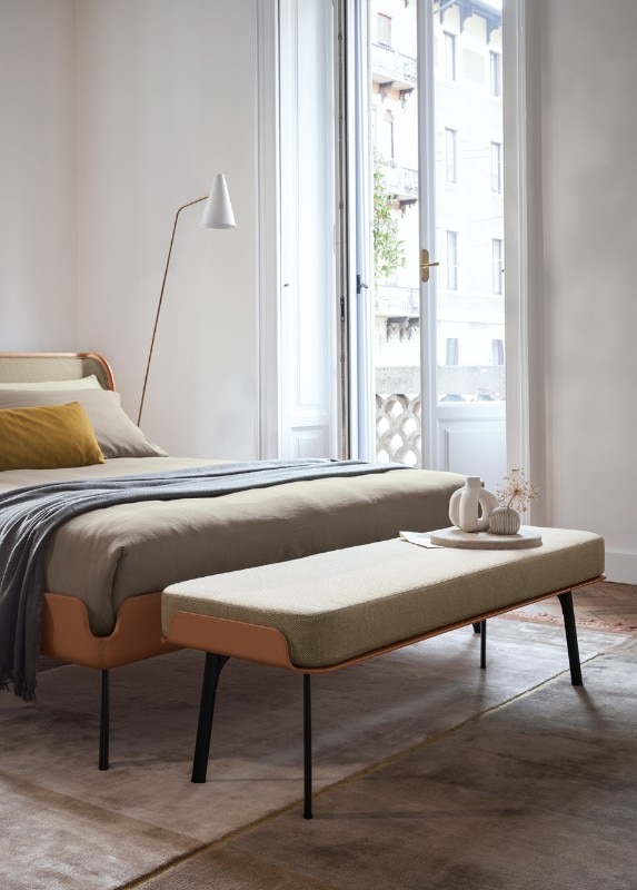 The profile of the bed is a single flowing line that runs along the entire perimeter and in the headboard evokes the idea of an enveloping embrace. Together with the bed, Bolzan presents a series of accessories that follow its style: an accessory shelf to be attached to the bed frame, a bench and a small round table, available in two sizes.