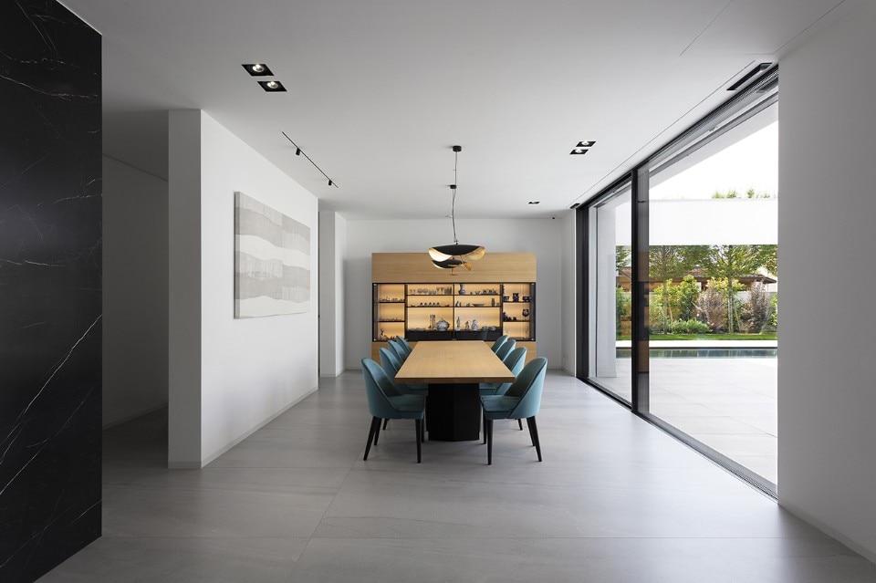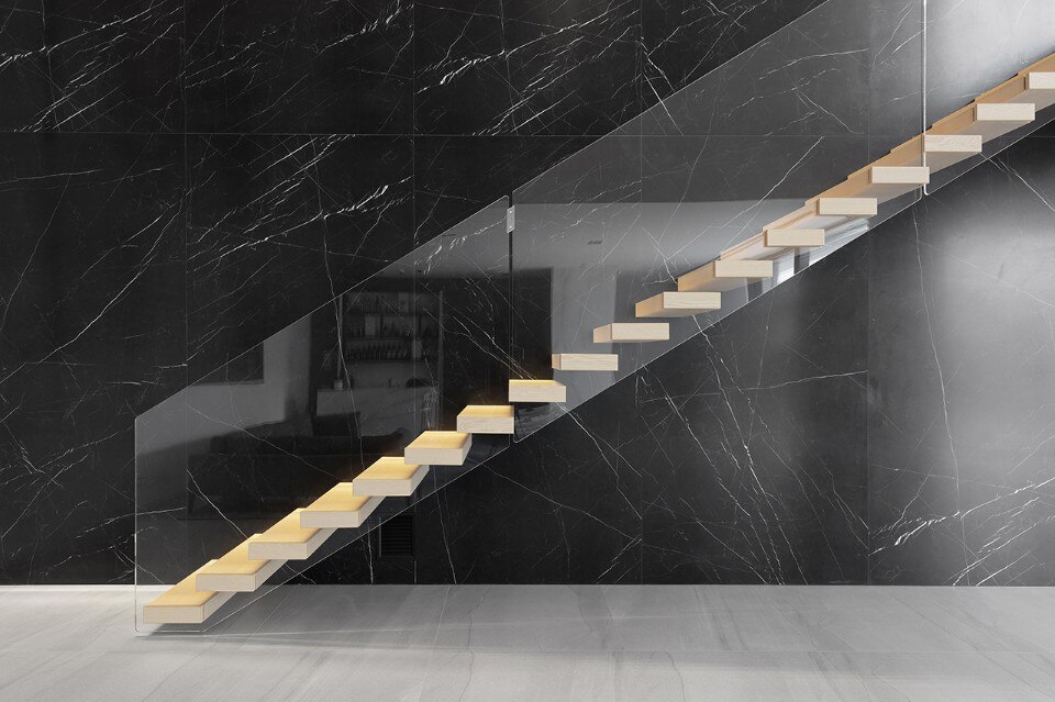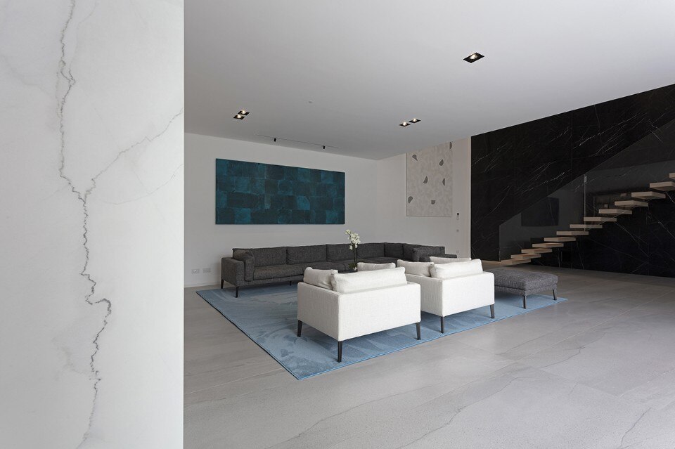 Among the various products used are the Marmi MaxFine Statuario Light 300x100 cm surfaces, which cover the walls of the entrance and the external covered atrium; the Marmi MaxFine Black Marquinia 300x150 cm collection with Silky finish was chosen for the double-height space that defines the living area.
