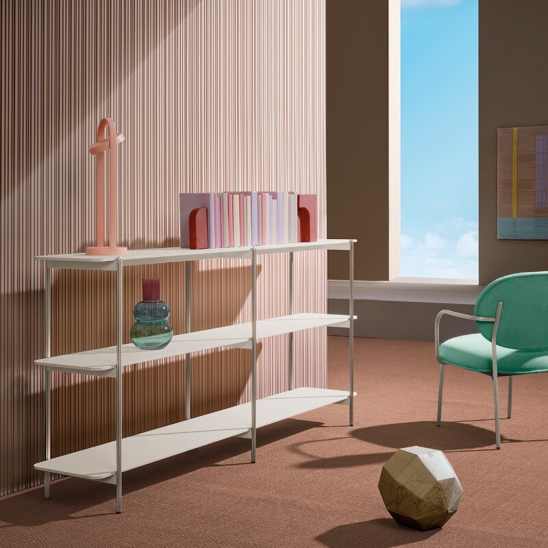 Moving to the third setting, we find the Blume System by Sebastian Herkner, a three- or four-level library system that echoes the sophisticated flower-shaped profile in extruded aluminium of the collection of the same name. The structure is painted in various colours for a decorative and playful appeal.