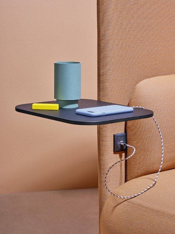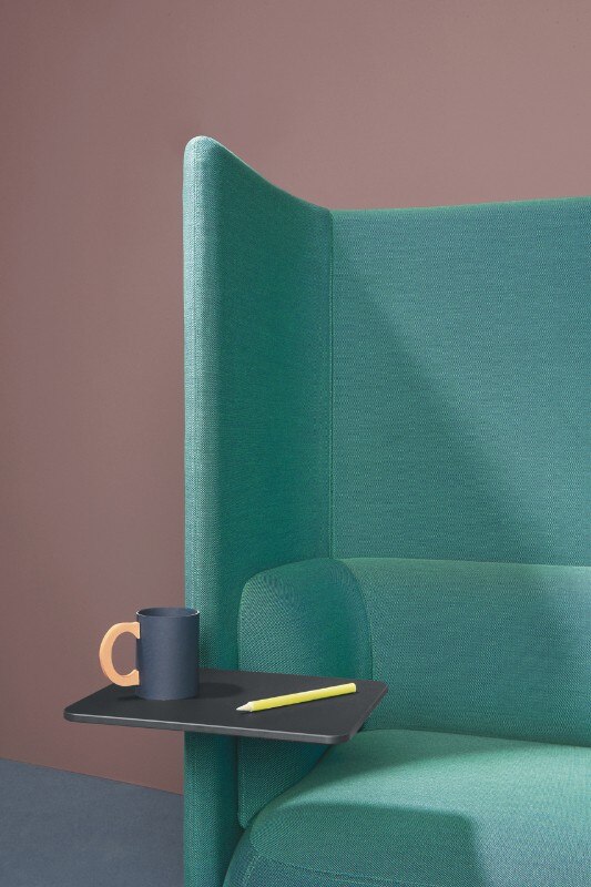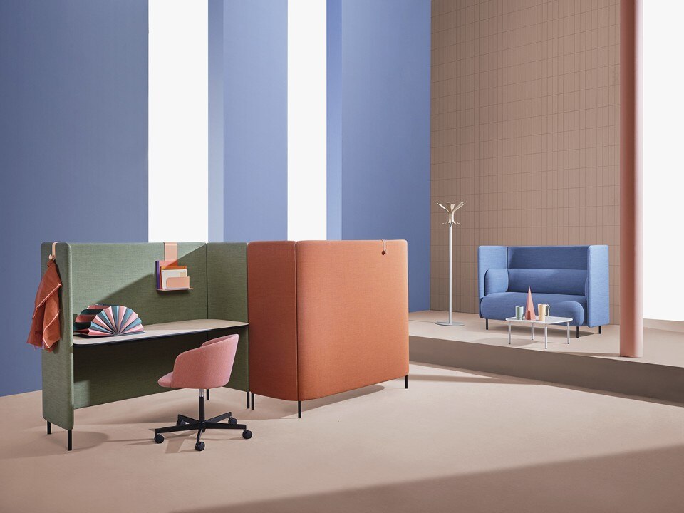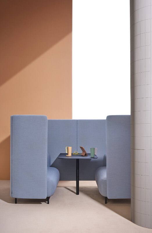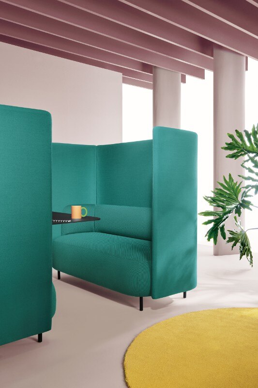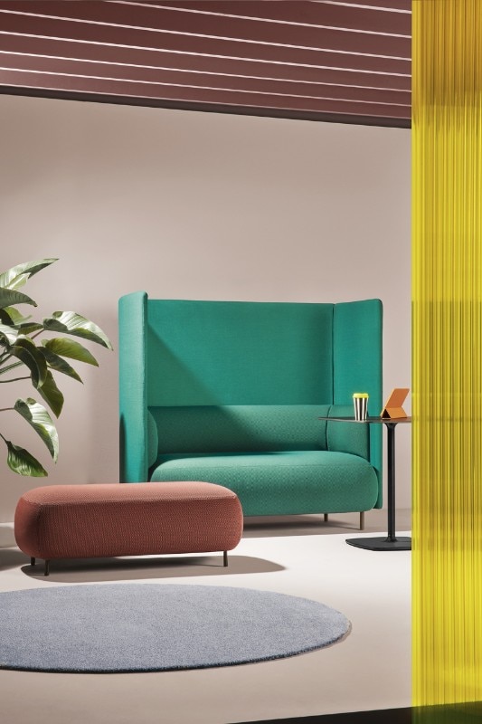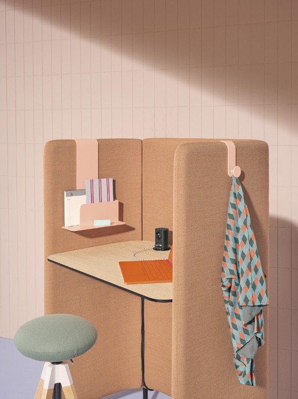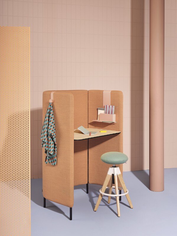 Designed as an informal workspace and located in the central lobby stands the Buddyhub Desk, the latest addition to the Buddy family recalling the collection's friendly and welcoming design. This is a functional and efficient workstation where users can concentrate and isolate. Buddyhub Desk features a perimeter sound-absorbing panel that embraces a solid laminate top, creating a sort of enclosed niche that ensures acoustic and visual privacy. A lower sound absorbing panel is proposed for the new version of Buddyhub in order to create dynamic compositions within lounge areas by combining elements of different heights.