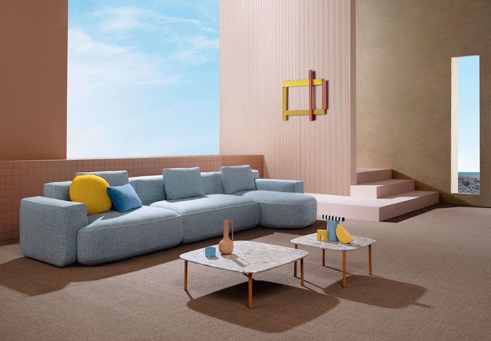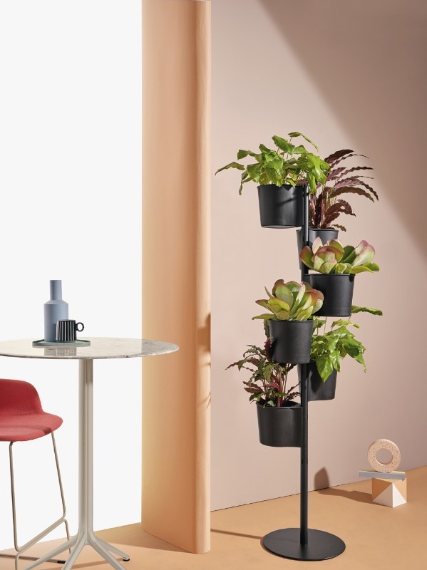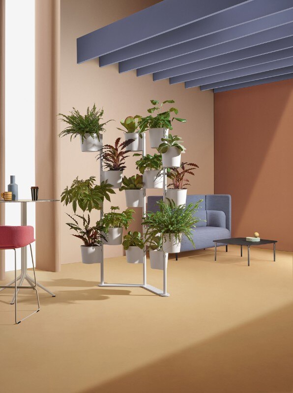 The next setting is a lounge area featuring Jeff, the modular sofa system by Patrick Norguet. Jeff is designed as a set of miniature architectures, skilfully combined to create multiple scenarios. This area is marked by the Hevea Partition by Victoria Azadinho Bocconi, a three-column pot-holder that creates green walls and layouts in work and hospitality spaces.