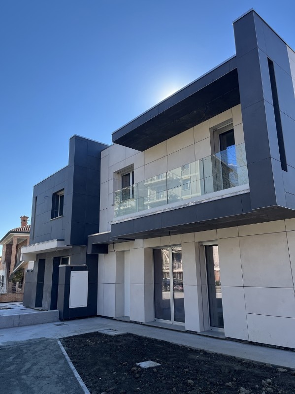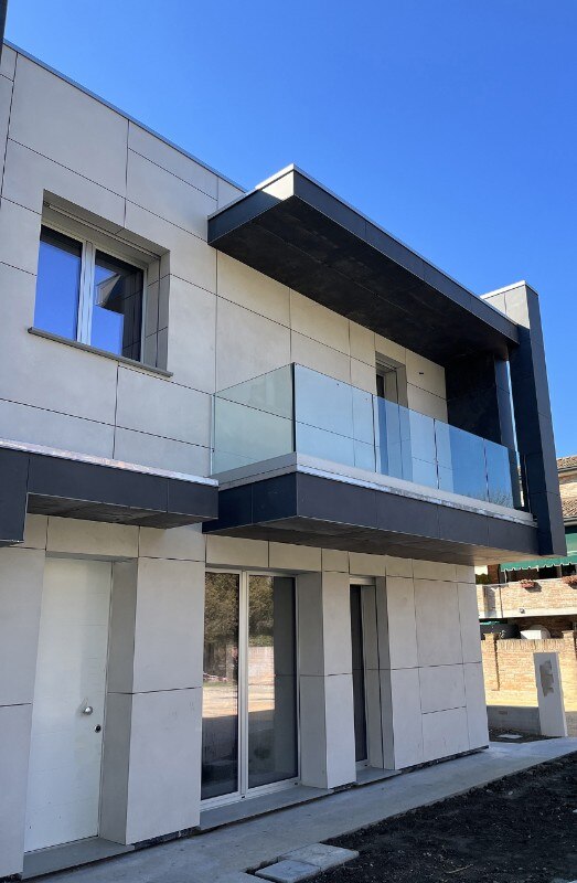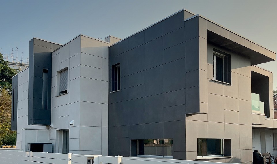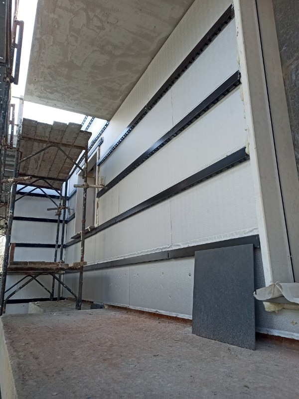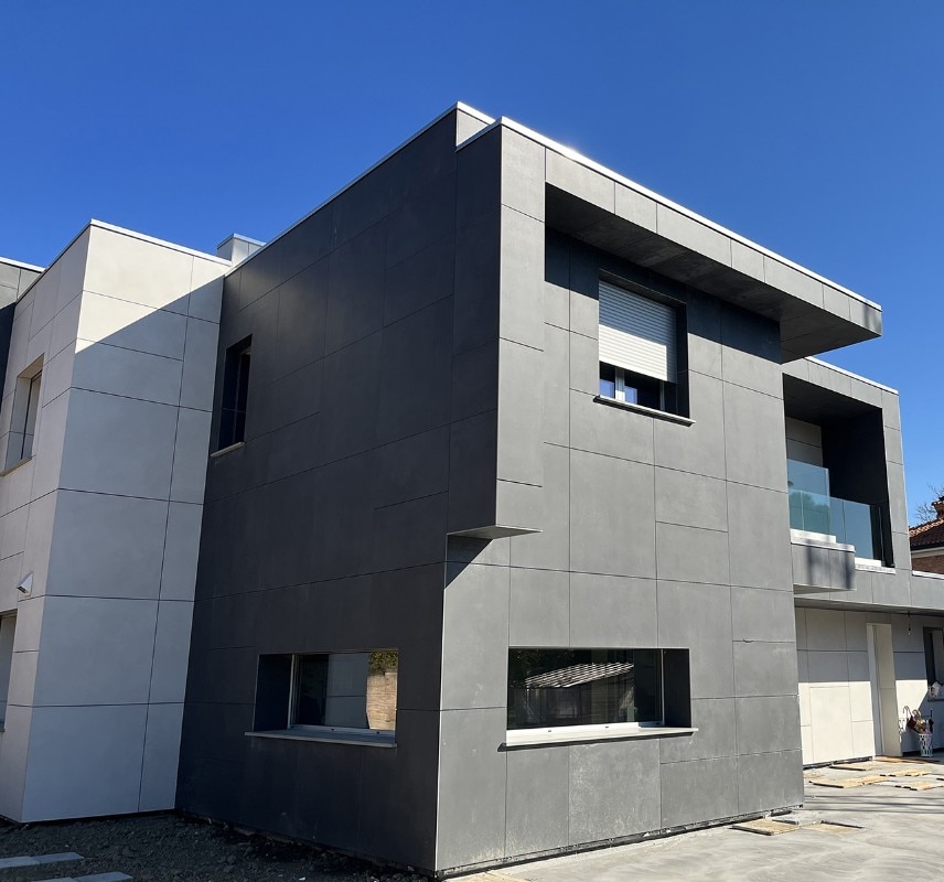 For the three-family residence in Ferrara, Isotec Parete insulation panels in 80 and 120 mm thicknesses were chosen for all the facades of the building, in order to give continuity to the technical laying solution, in a functional and practical manner. In fact, the load-bearing metal substructure, which the Isotec Parete system creates thanks to the metal stiffener inserted in the panel, with a single laying step at the same time as the insulation layer, is extremely practical, also for the management of the geometries of the multi-format cladding. To the metal stiffener, here chosen in black to obtain an elegant effect of invisibility of the substructure, the stoneware slabs in the colours cream and anthracite have been anchored by means of metal clamps, inserted in the kerf cuts of the ceramic.