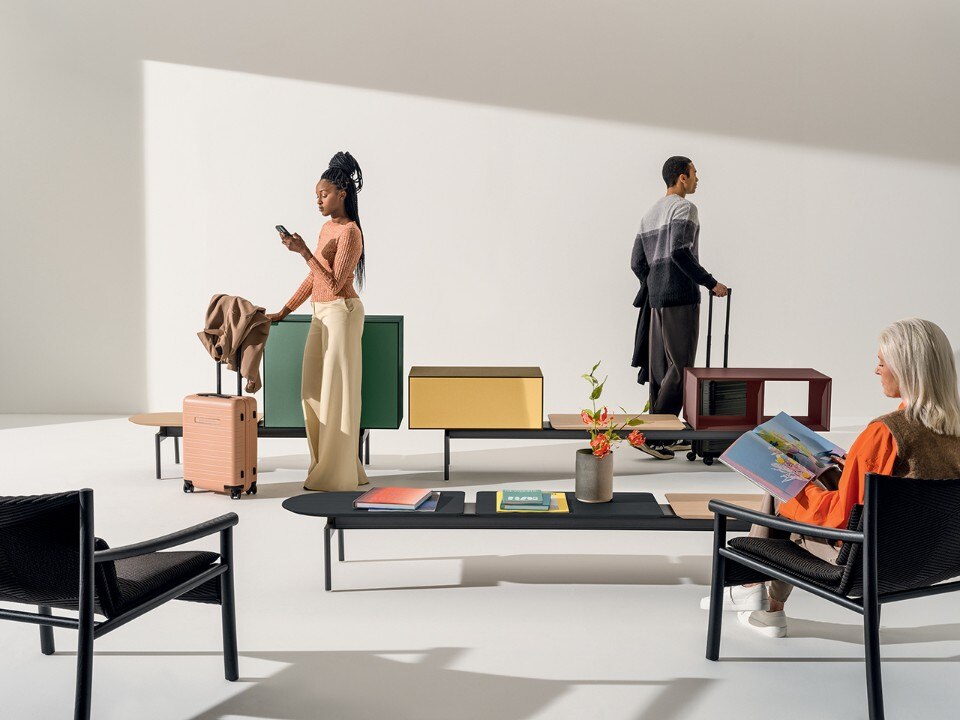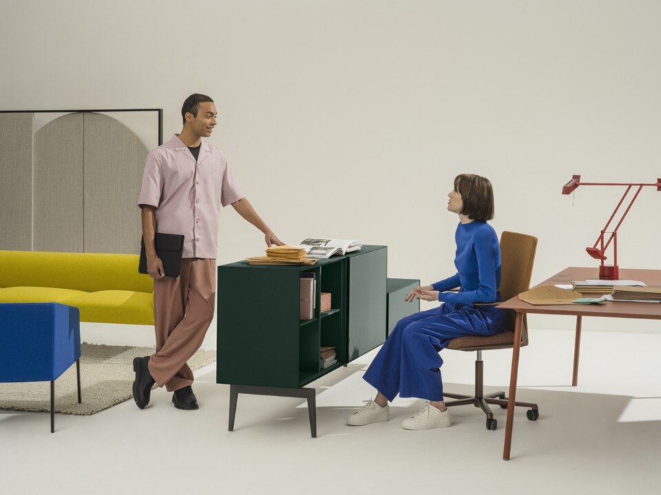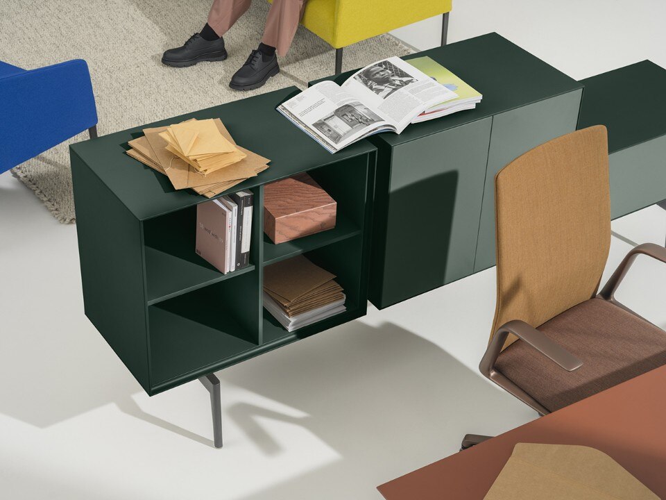 Aluminium legs, wooden shelves and storage units: the furniture designed by García Cumini for Arper allows a variety of combinations to fit into any space.