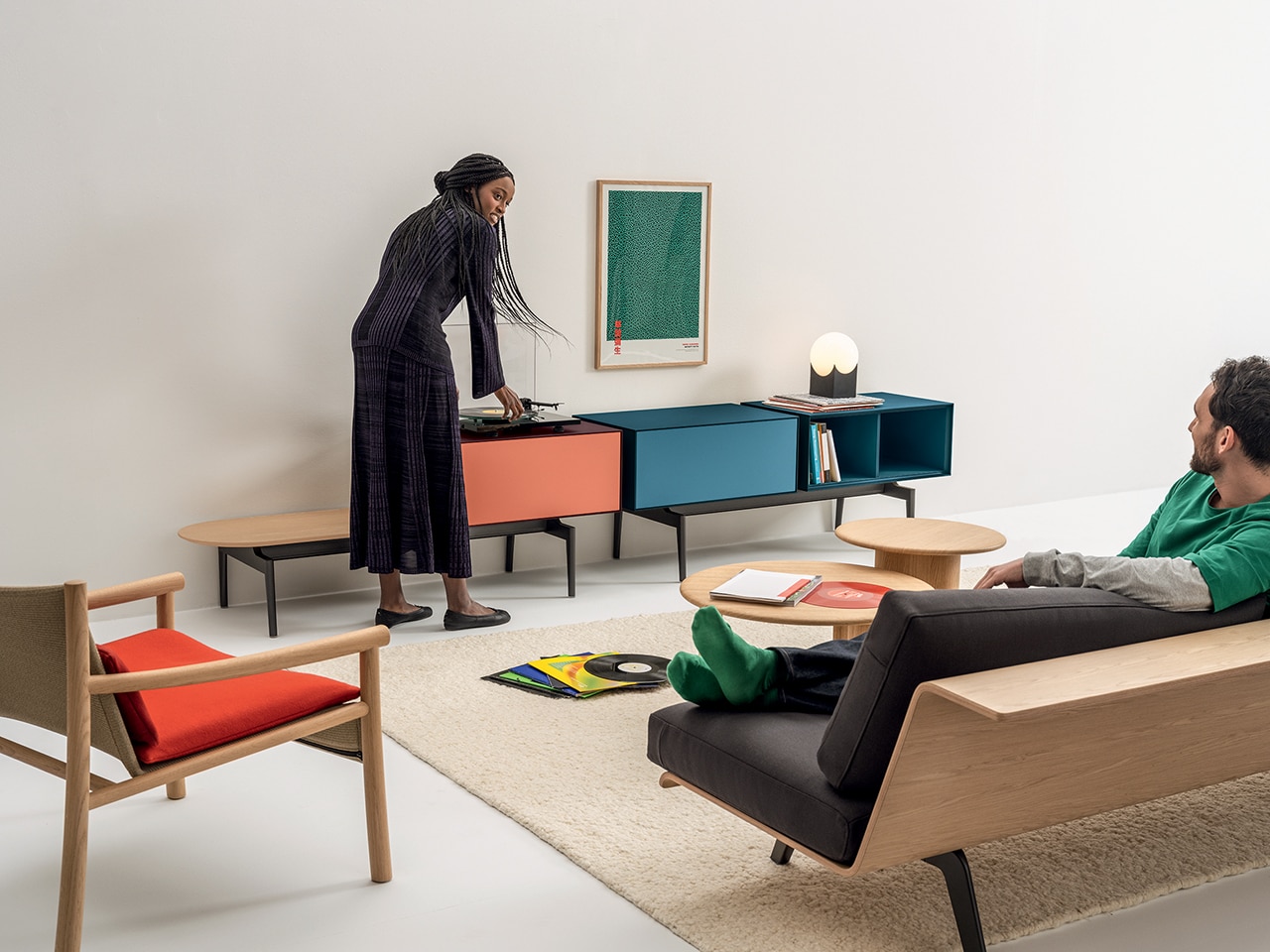 The modular system consists of bases and shelves in two lengths, plus three modules in two different heights, available with doors, open or closed shelves on one side. The sculptural effect of the base adds a touch of refinement to the design of Semiton, which can become the characterising element of a room or fit delicately into any context. The modules can be individually customised with a wide range of MDF panels in vibrant colours, or with wood veneers, to create lively solutions or sophisticated monochrome effects.