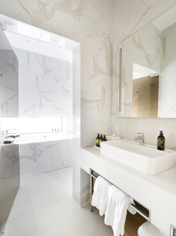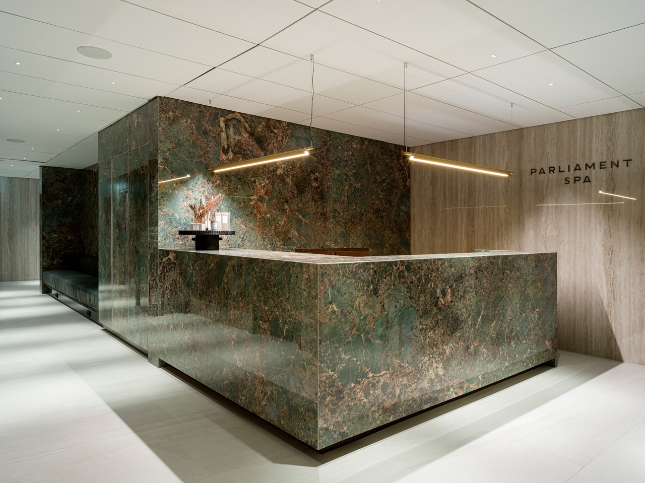 Different areas therefore correspond to different languages and different atmospheres, and for the ceramic cladding, the products from Iris Ceramica Group brands – Ariostea, FMG Fabbrica Marmi e Graniti, Iris Ceramica and SapienStone – have provided a visual expression capable of shaping the visitors’ experience: on the outside, in addition to metal for the ventilated façade and reinforced concrete, technical ceramics and natural stone are used for the walls, while, as Gianfrancesco has told Domus, “the interior was designed by balancing opaque and shiny surfaces, cold and warm materials, with the firm goal of welcoming and ensuring maximum comfort for the guest staying in the hotel. In the more public areas, low-reflectivity and neutral tones tones have been favored, such as those of Quarzite, the technical ceramic by FMG”.