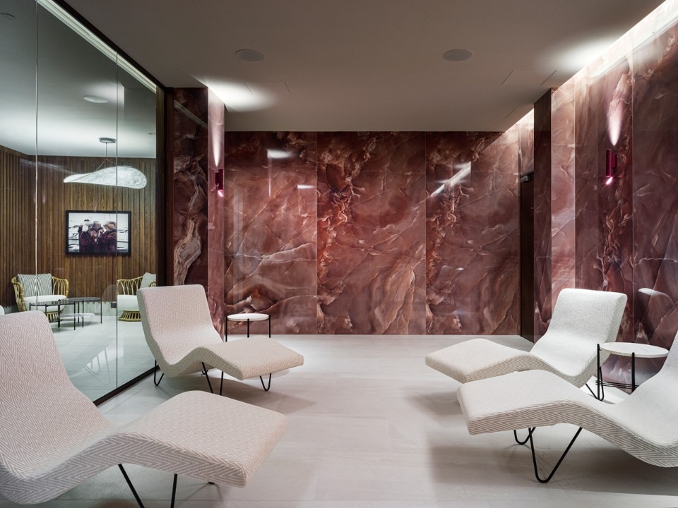 The newly created spa, on the other hand, aims to convey the experience of a rich, yet cozy environment. “We are in the world's northernmost capital city, and people, returning from particularly cold excursions, is welcomed into a warm space of relaxation. Ceramic wall tiles were chosen that evoke natural elements such as stones and marbles with scenically striking wraparound graphics and colors that convey tranquility and a sense of exclusivity”. The same multiplicity of languages is then reflected in the custom furnishings, and the range of materials spans categories from velvet to ecological leathers to porcelain stoneware.