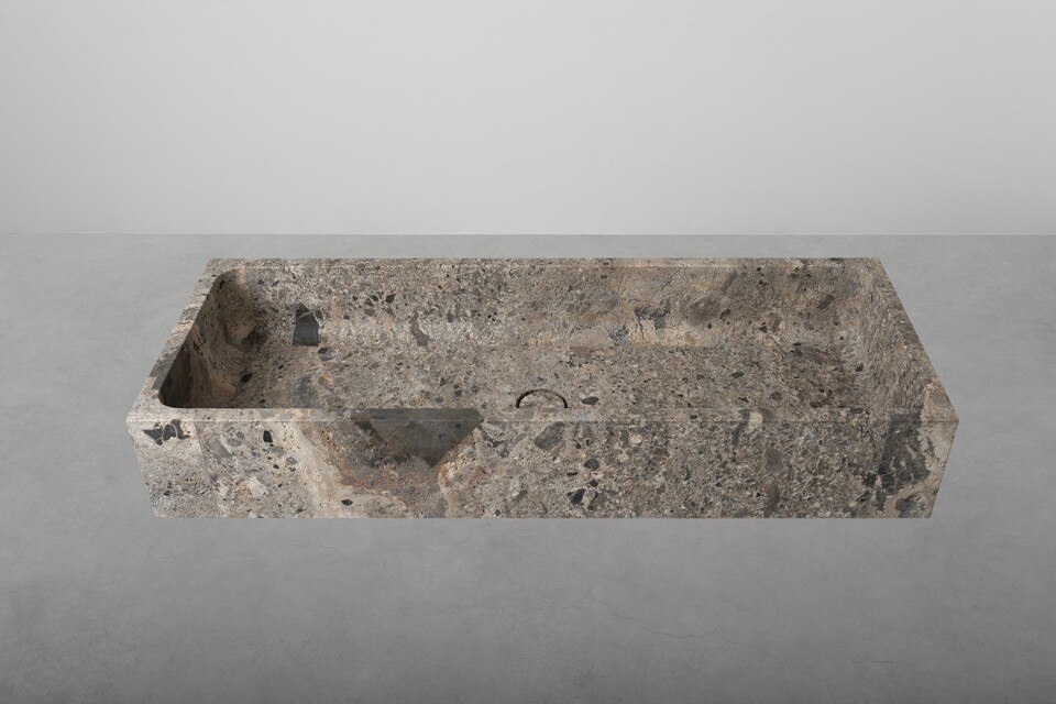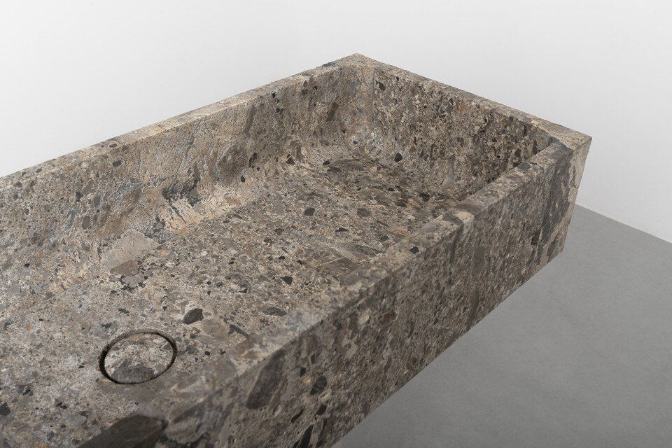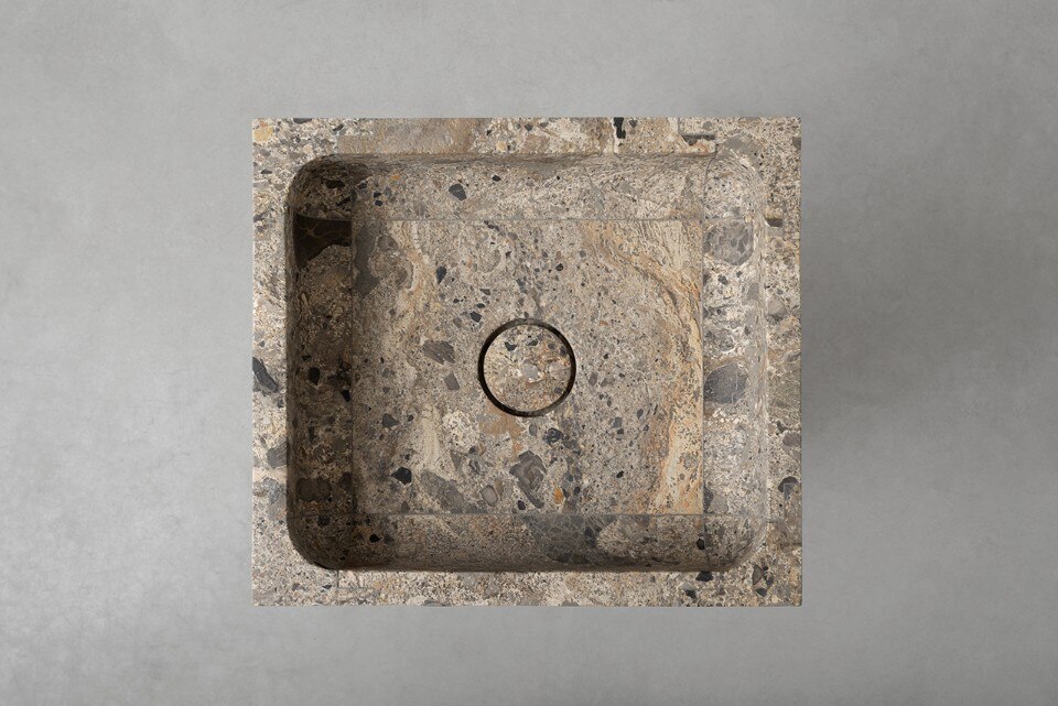 This type of design makes it possible to achieve visual and aesthetic continuity with the rest of the collection, reduce the material used and achieve the same thickness. This construction detail becomes an element that aesthetically connotes the collection. In the case of the Fidia washbasins, the natural chromatic and material variability of the stone ensures that the end result gives the furnishing accessories a unique value.
