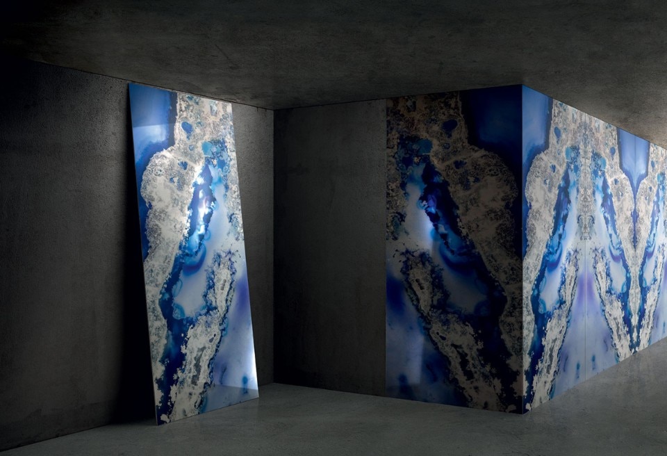 The product's technical performance also includes resistance to moisture and chemicals such as chlorine - making it perfect for underwater use. For this project, three different types of sheets were selected. The Clouds colour with its intense green that gives the pool emerald reflections, Galaxy in shades of blue and silver inspired by the bright and remote galaxies, and Reef that takes inspiration from the depths of the ocean and the magnificent colours of coral reefs. The slabs, available in the large 120*280cm format, have been cut into square surfaces to create a unique decorative pattern that seems to be inspired by Rorschach's spots. The pools are completed by walls covered with Sicis mosaic, in shades that harmonise perfectly with the colours of Vetrite, creating an ambience of rare beauty and timeless luxury.