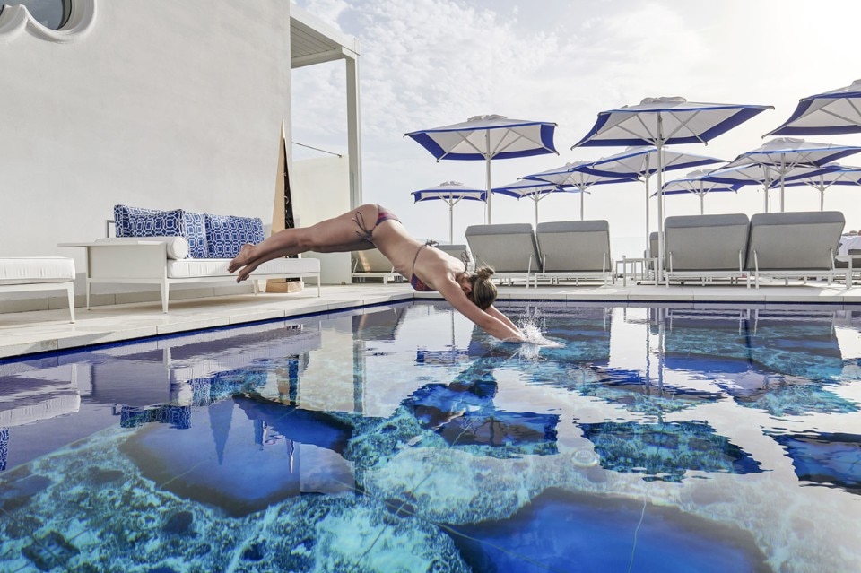 The boutique hotel recently renovated its outdoor swimming pools, turning what could have been a normal maintenance operation into an opportunity to further embellish the site's outdoor spaces. All this thanks to the collaboration of an Italian company, Sicis, and its Vetrite collection, composed of laminated glass sheets with bewitchingly coloured decorations inside.