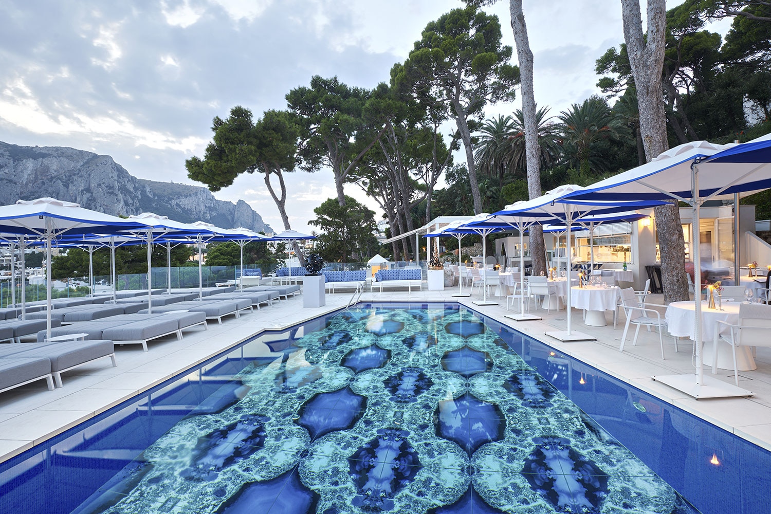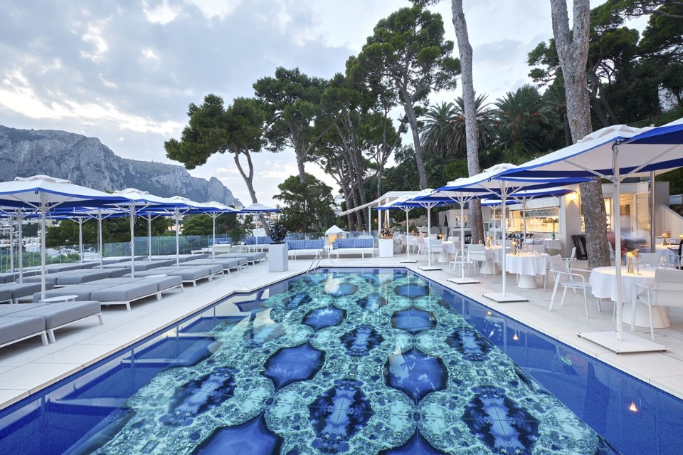 The outdoor pools at Capri's Hotel Scalinatella are characterised by the unique decorative patterns of the Vetrite laminated glass sheets, produced by the Italian company Sicis.