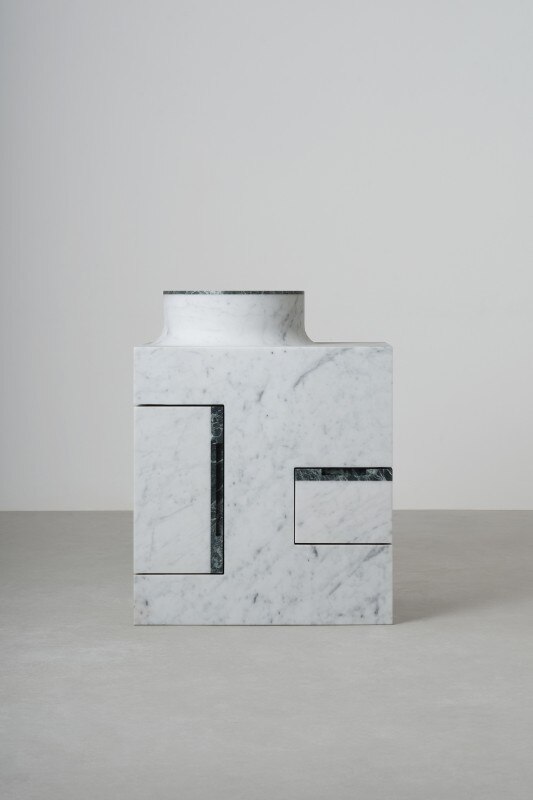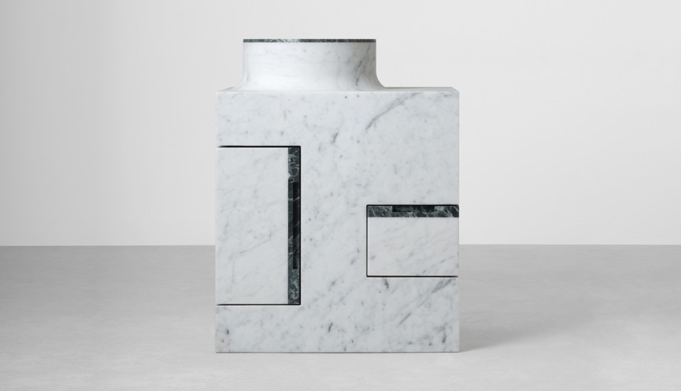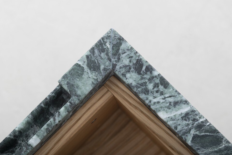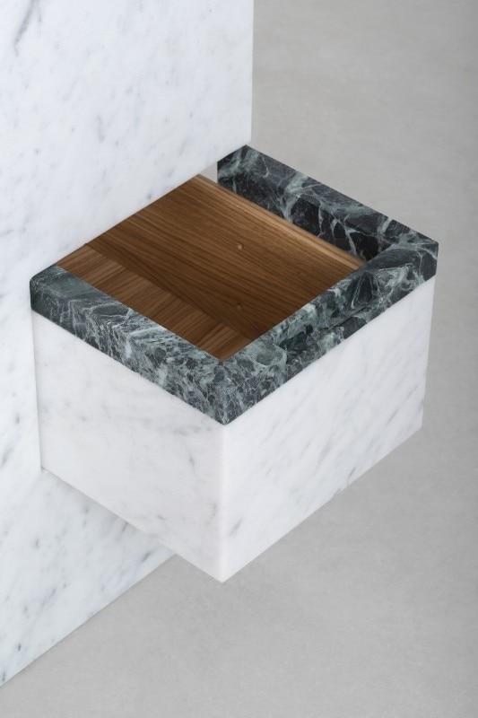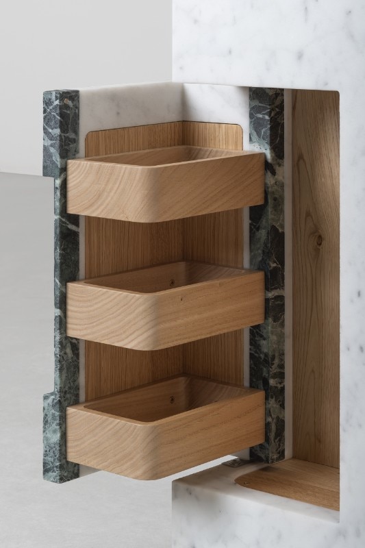 Finally, the bi-material block is transformed into a bathroom cabinet thanks to the drawer and the pivot door on the corners that conceals the solid oak storage units. Here, too, the characteristic stone combination is proposed with the handles carved into the coloured marble inlay.