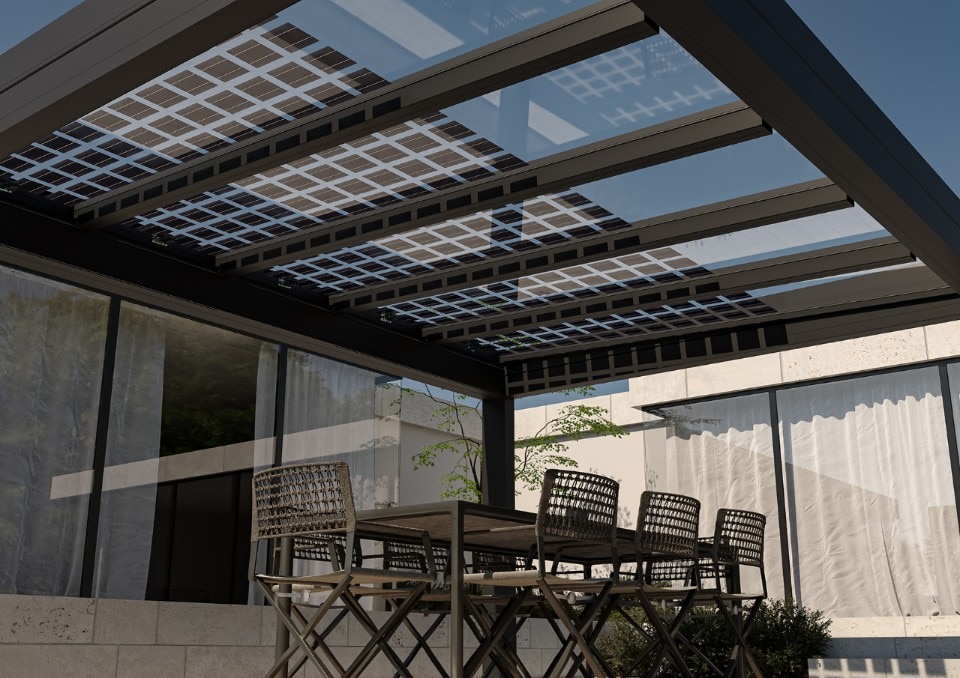 Bioclimatic solar greenhouses and conservatories with laminated glass roofs from KE's Sunlight range can integrate a photovoltaic system on the ceiling.