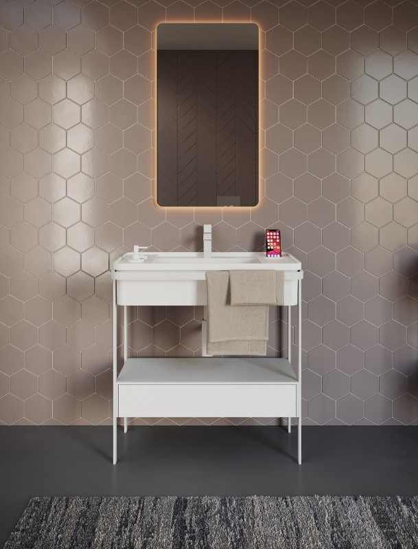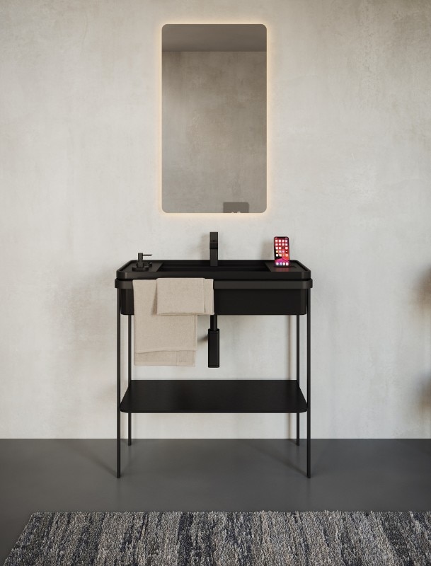 SDR Ceramiche follows this attitude with its first Vanity Unit Pilò, designed by Paolo D'Arrigo. It is in fact a product that offers all the necessary comforts for a complete beauty routine: a piece of furniture composed of a powder-coated stainless steel structure and a ceramic washbasin, whose essential design includes storage compartments, shelves and niches for smartphones, soap dishes and towel rails.