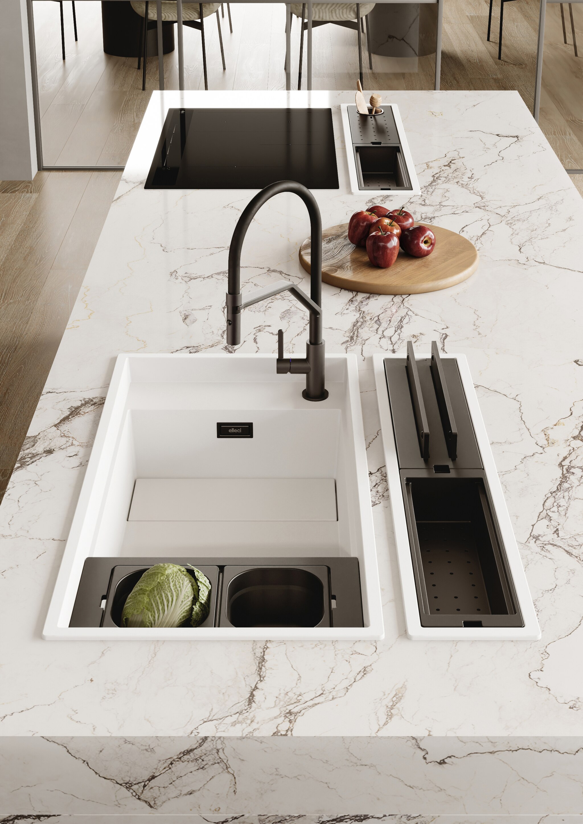 For Elleci, which has just launched its new Élite Kitchen collection, the sensory experience linked to the world of food begins with the components of the kitchen environment itself. The surfaces are made of Keratek, an innovative material that achieves high performance levels in terms of durability, hygiene and ease of use: it is easy to clean, impact resistant and boils water instantly. Composed of quartz, micro-ceramics and a blend of acrylic resins, Keratek is completely opaque and silky to the touch. Available in six colours, it enhances the design of the sinks when combined with metallic finishes, creating an elegant and modern effect.